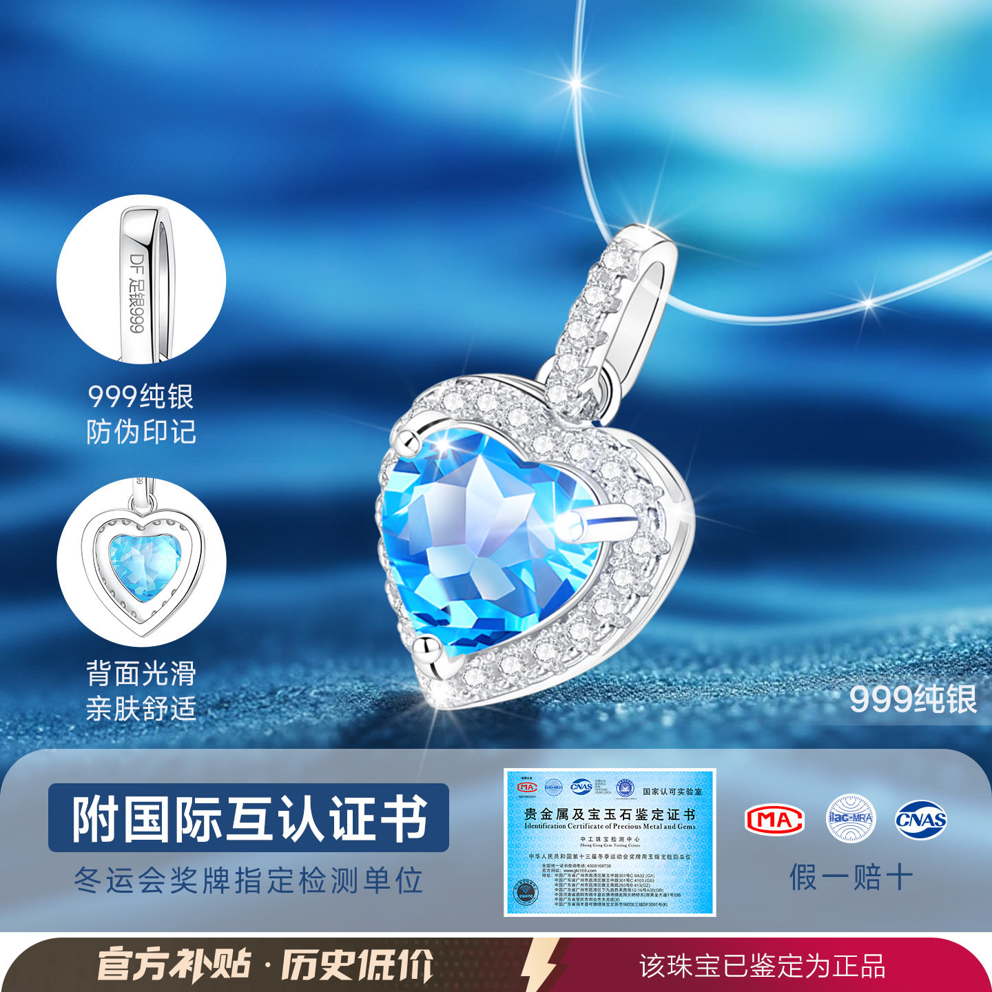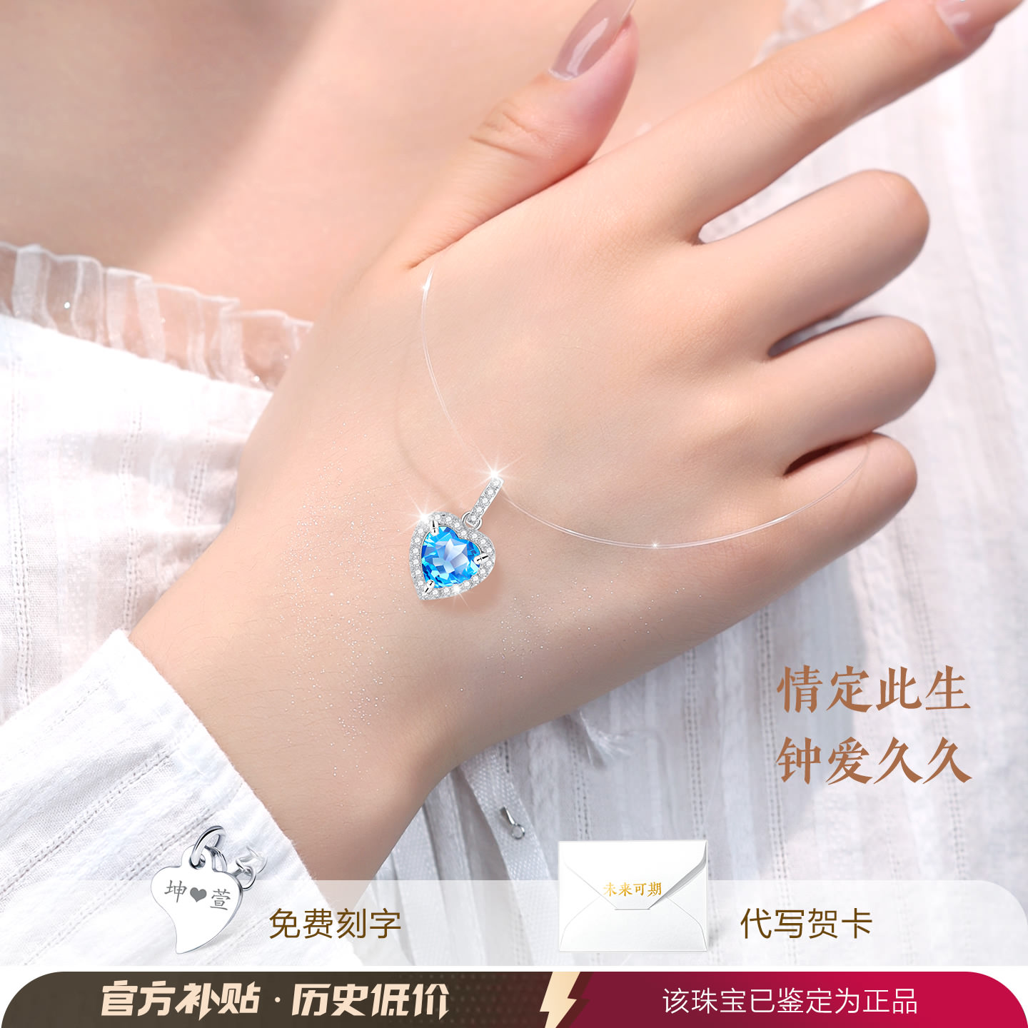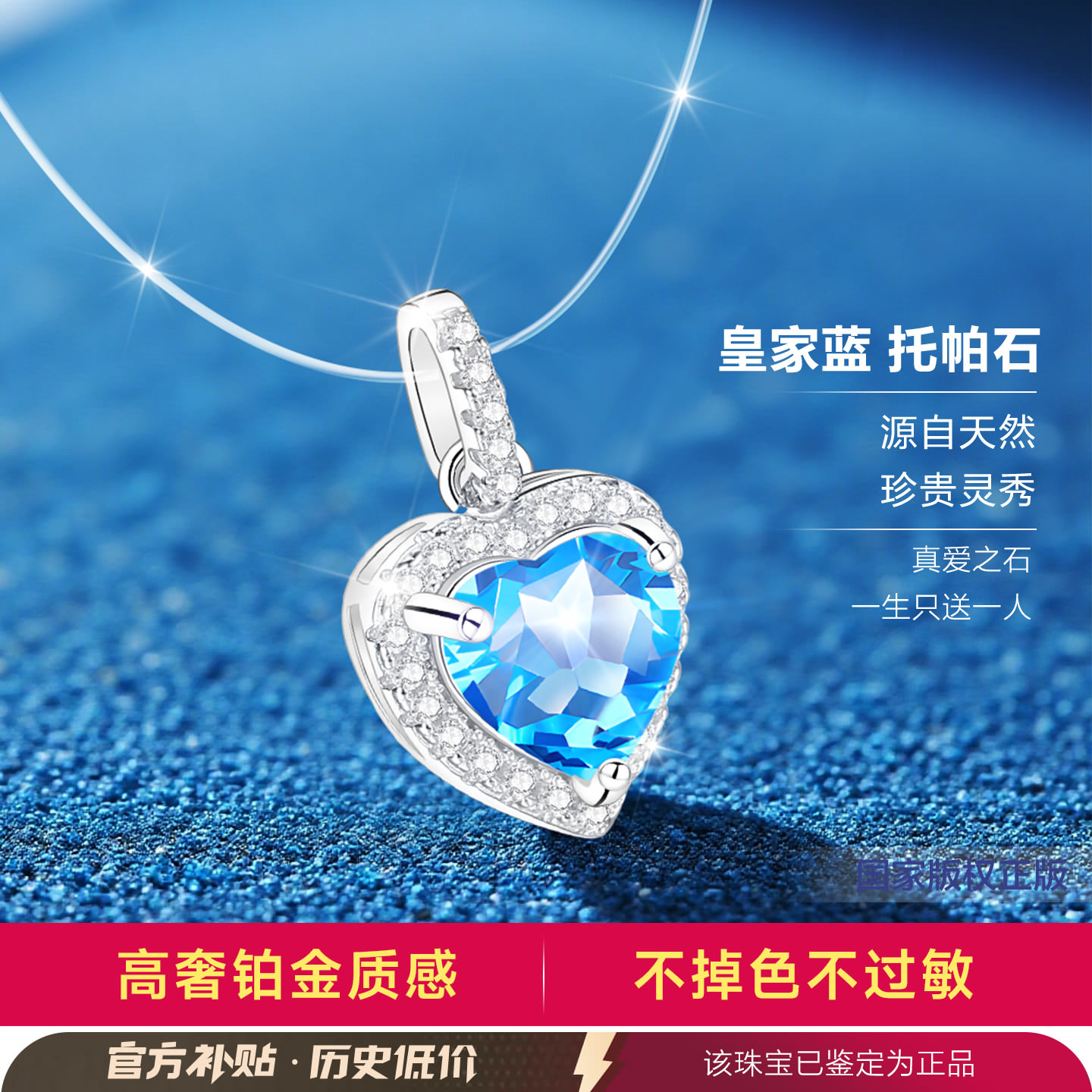 海洋之心999纯银银项链隐形鱼线女士女款天然宝石托帕石足银吊坠