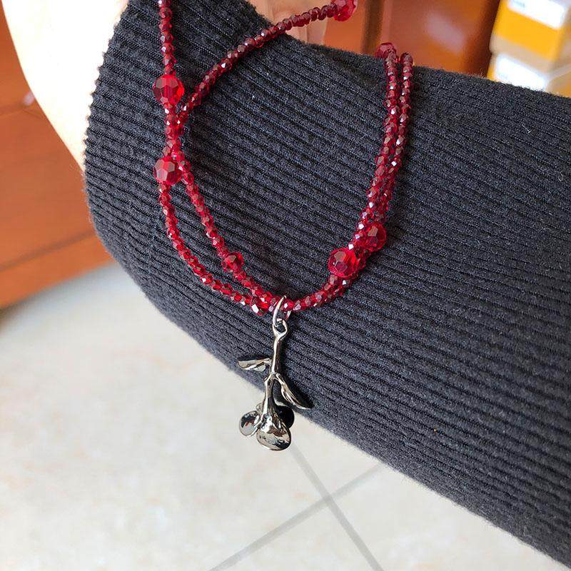 枪黑玫瑰吊坠双层天然石串珠项链女式安哥拉红色锁骨链