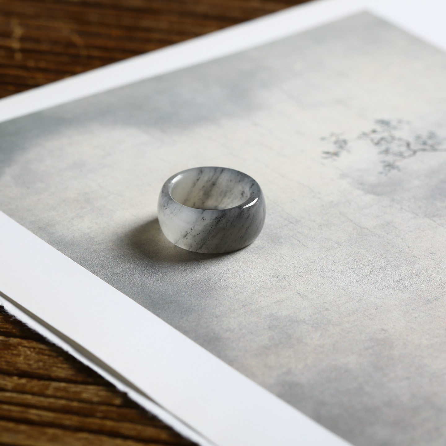 7号戒指 新疆和田玉青花籽料 籽玉小尺码圆弧素圈宽条指环尾戒692
