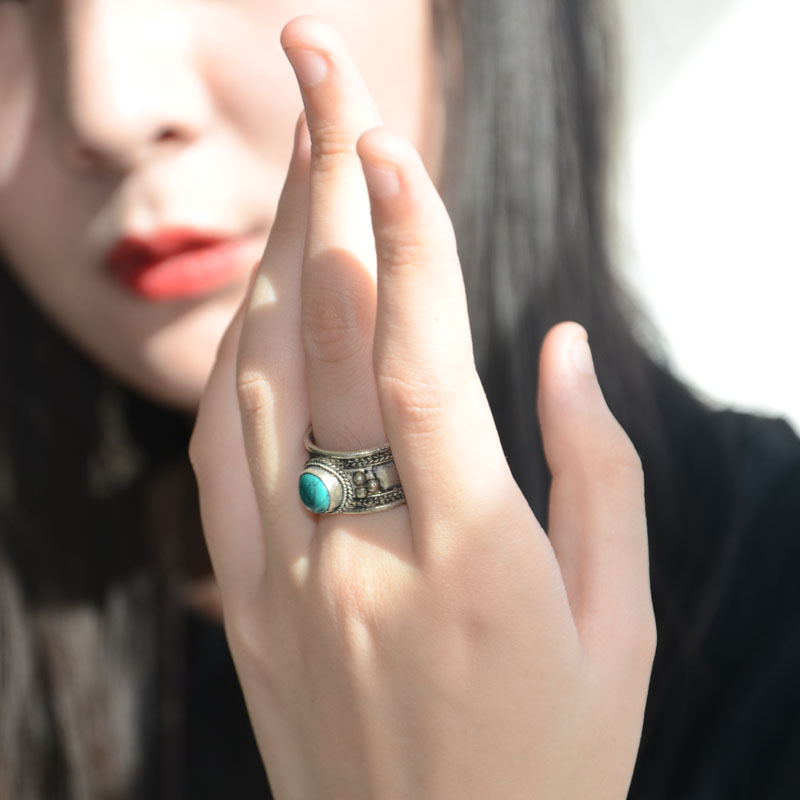 西藏民族风尼泊尔指环银白铜戒指镶天然绿松石青金石开口活口男女