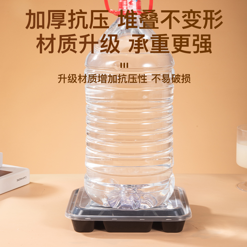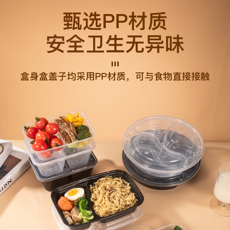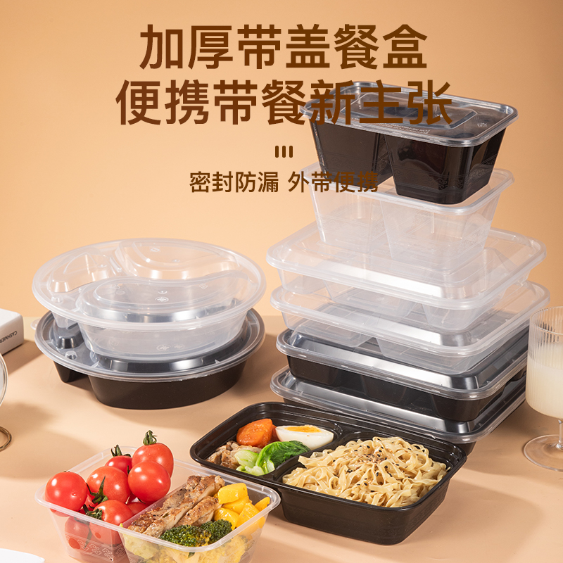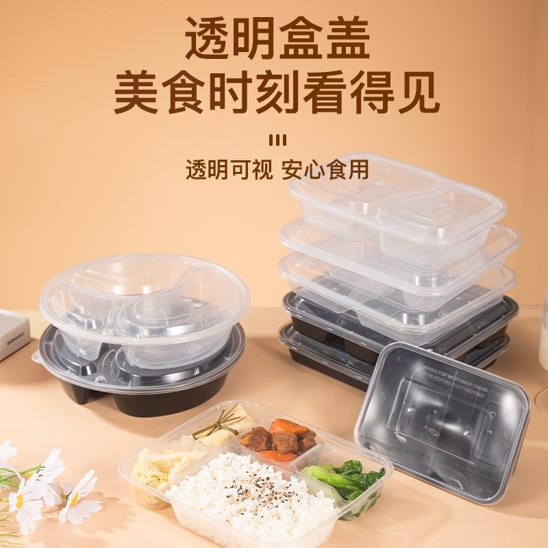虹枫三格圆形一次性快餐盒黑色外卖打包盒分格便当水果饭盒包邮