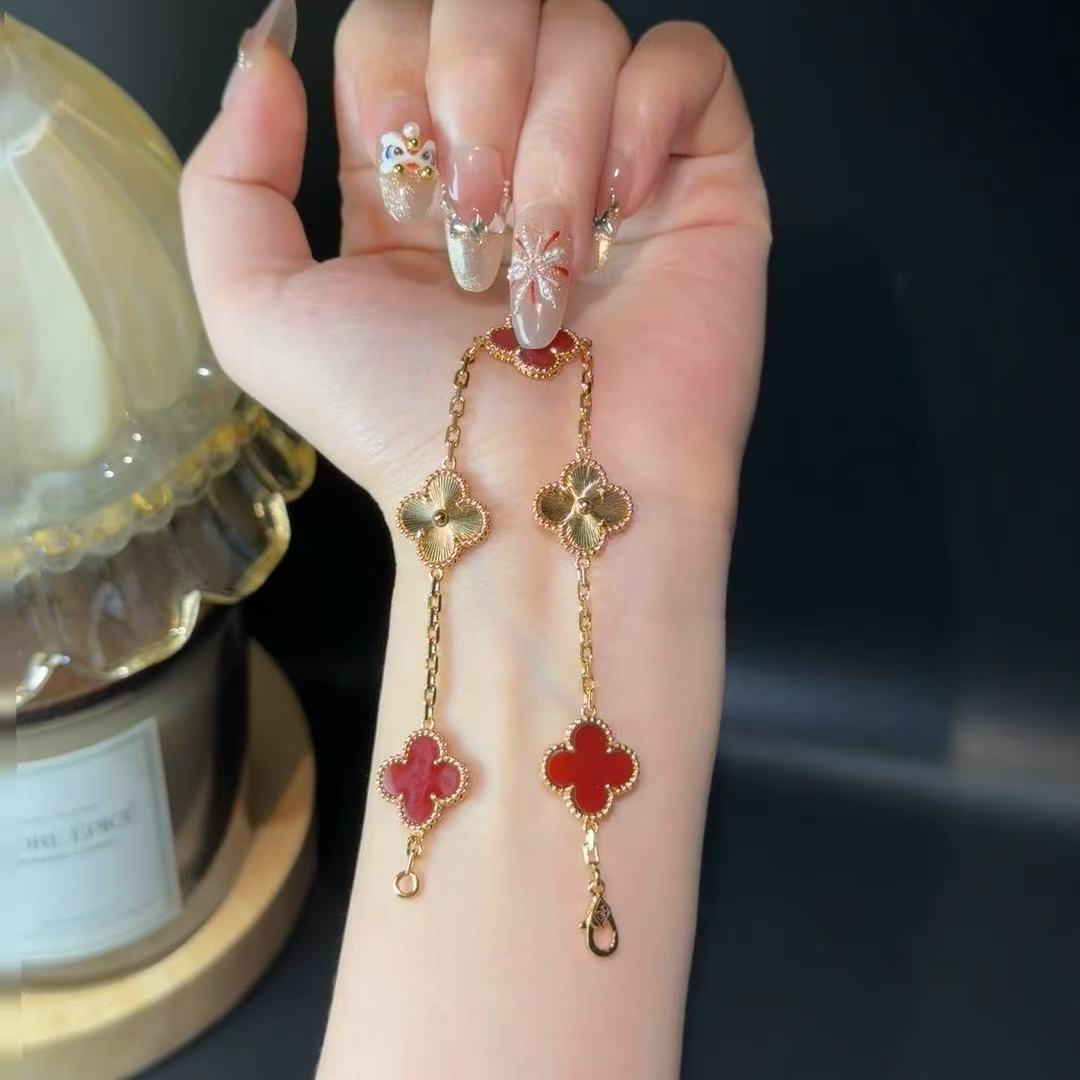 天然红玉髓镭射幸运草五花手链轻奢玫瑰金手饰贝母叠戴黄金桃花