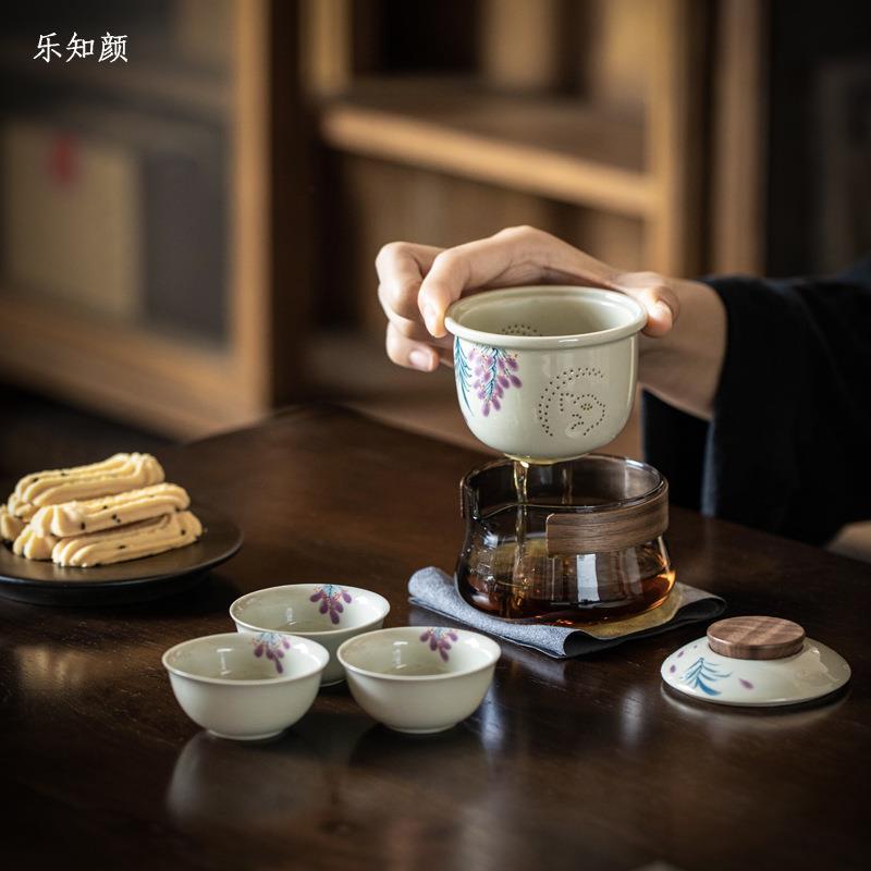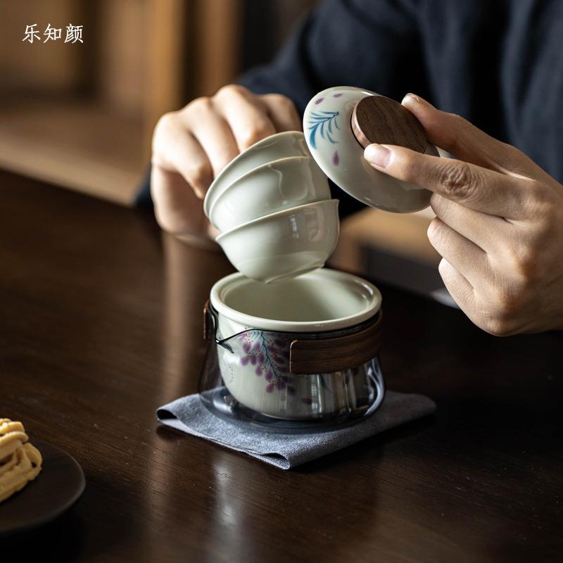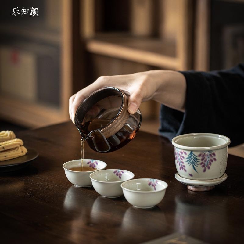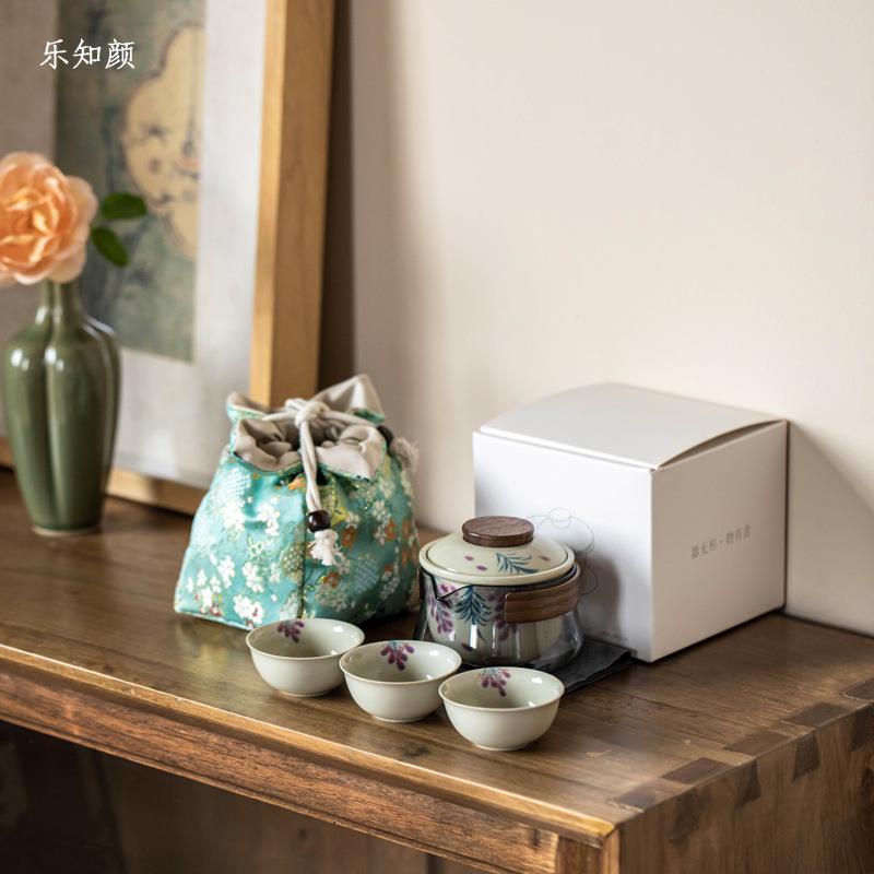 陶瓷收纳旅行布包户外便携式纯手绘紫藤一壶三杯快客旅行茶具套装