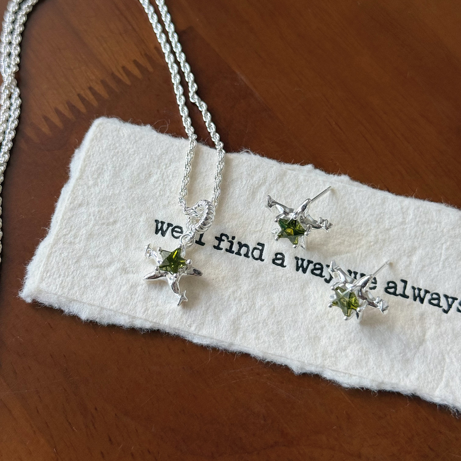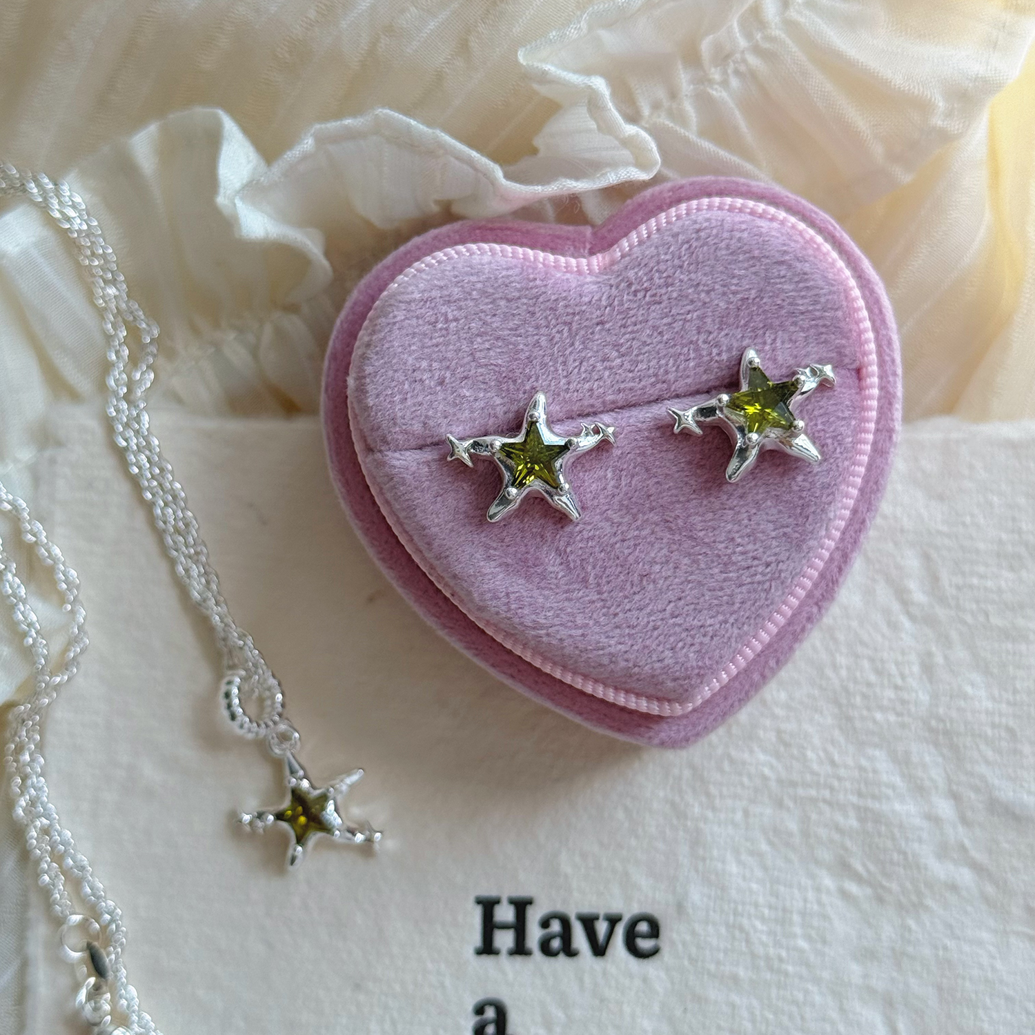 浅绿星星微镶锆石可爱耳钉项链毛衣链套装925银针叠戴时髦高级感