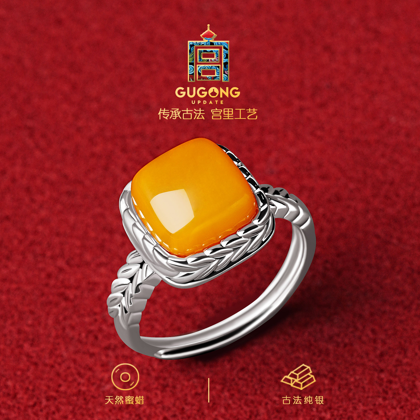 宫里上新蜜蜡戒指女纯银宝石小方糖指环小众设计生日礼物送妈妈