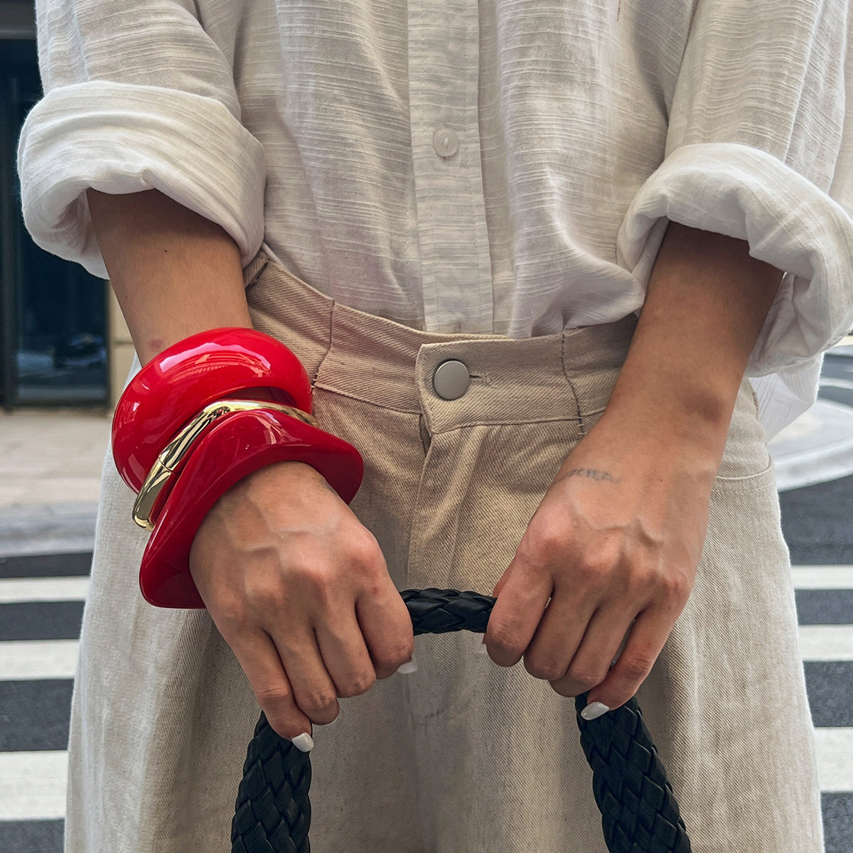 欧美跨境设计感不规则红色亚克力树脂手镯 ins风金属光面弹簧手环