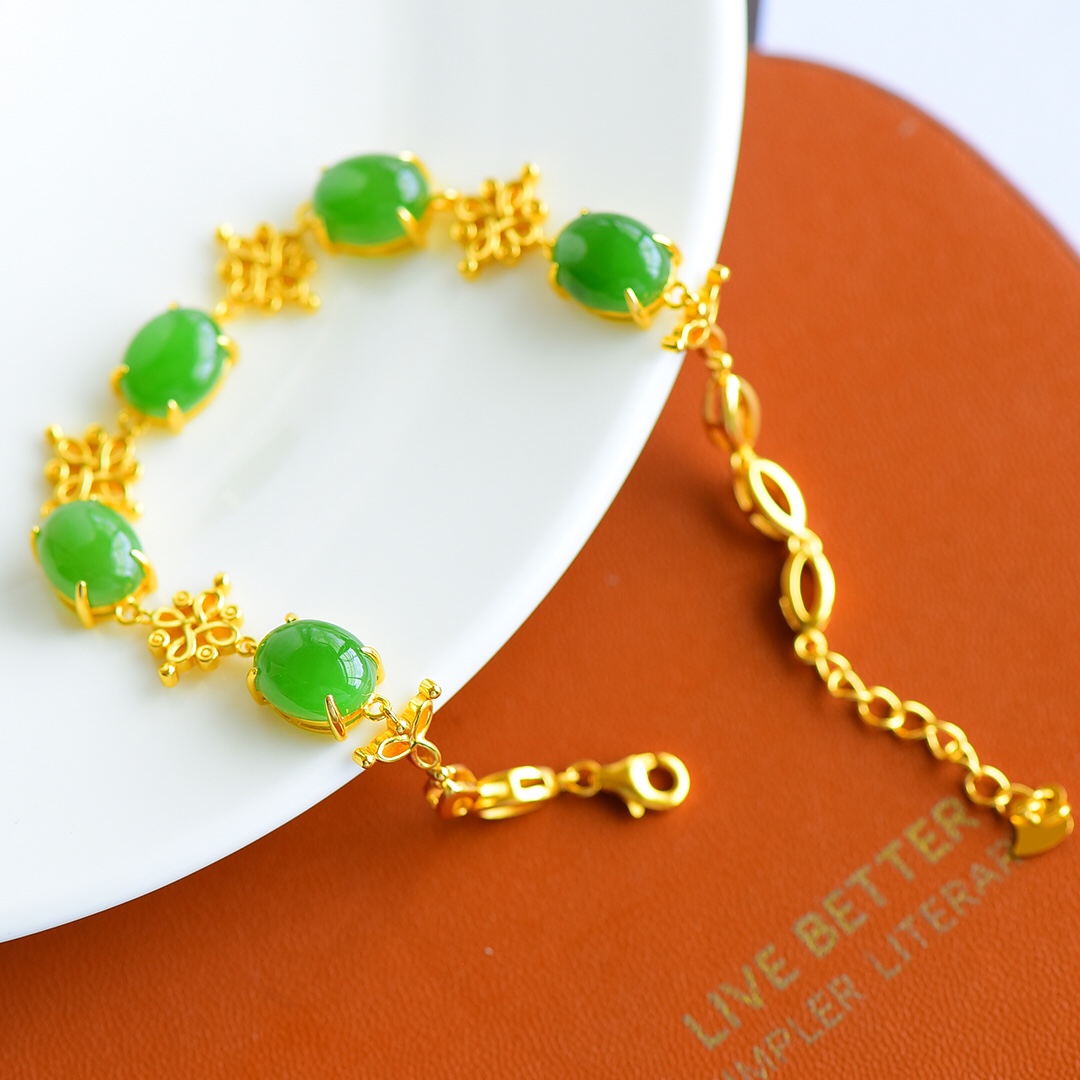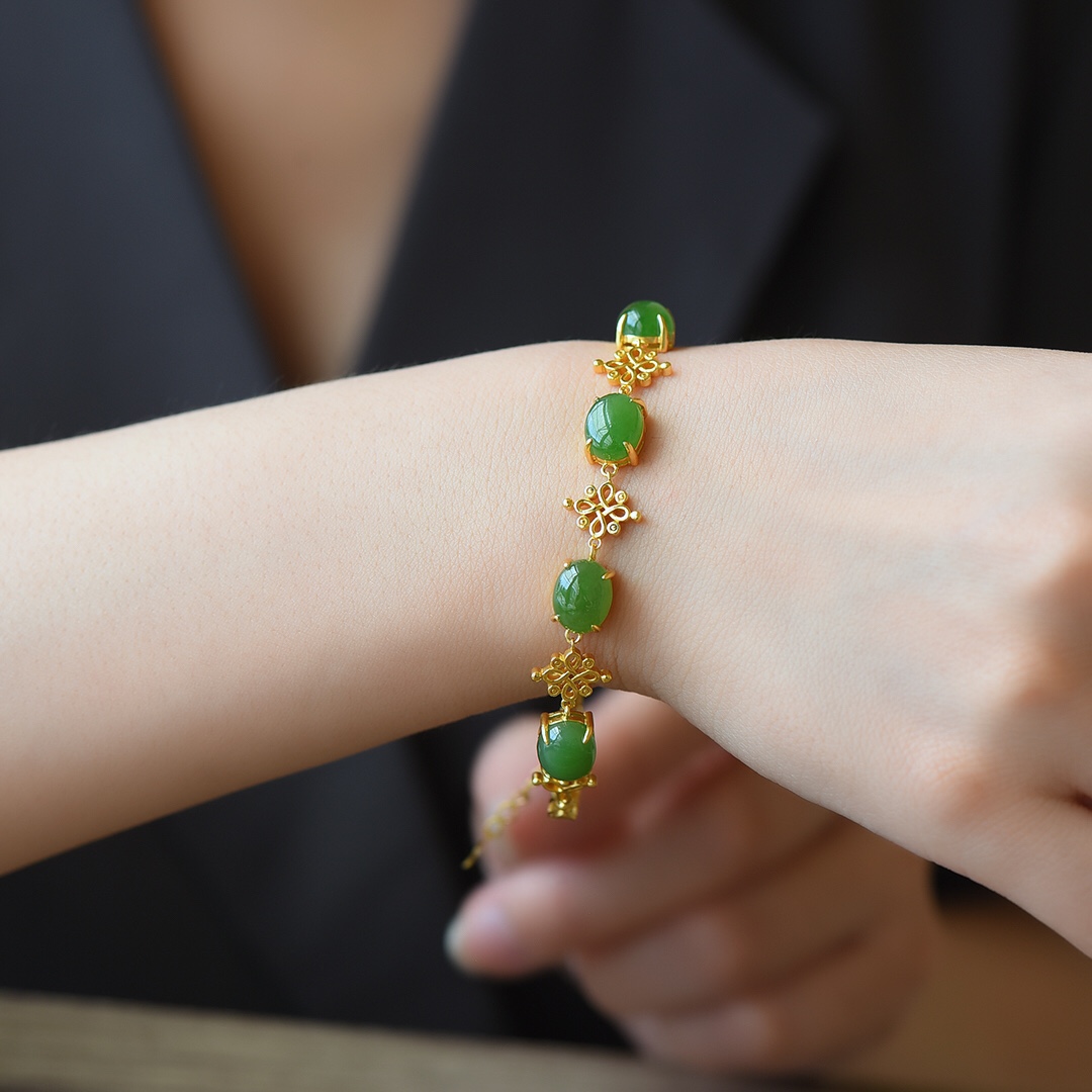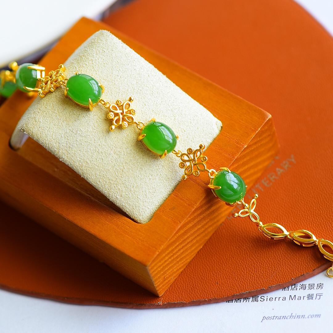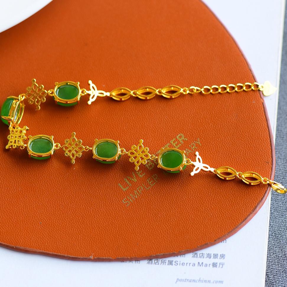 S925银镀18K金镶嵌天然新疆和田玉碧玉手链女款时尚高档大气玉石
