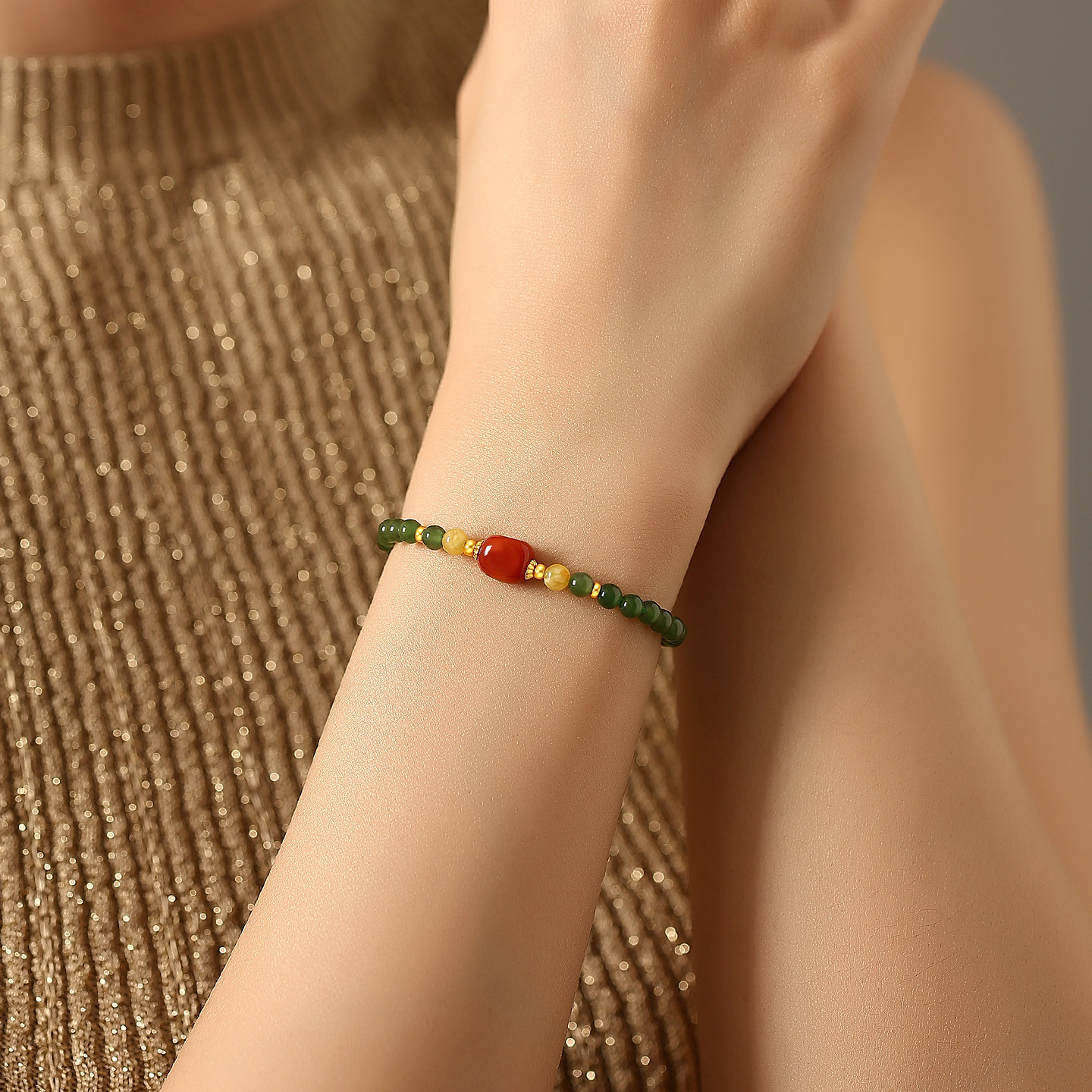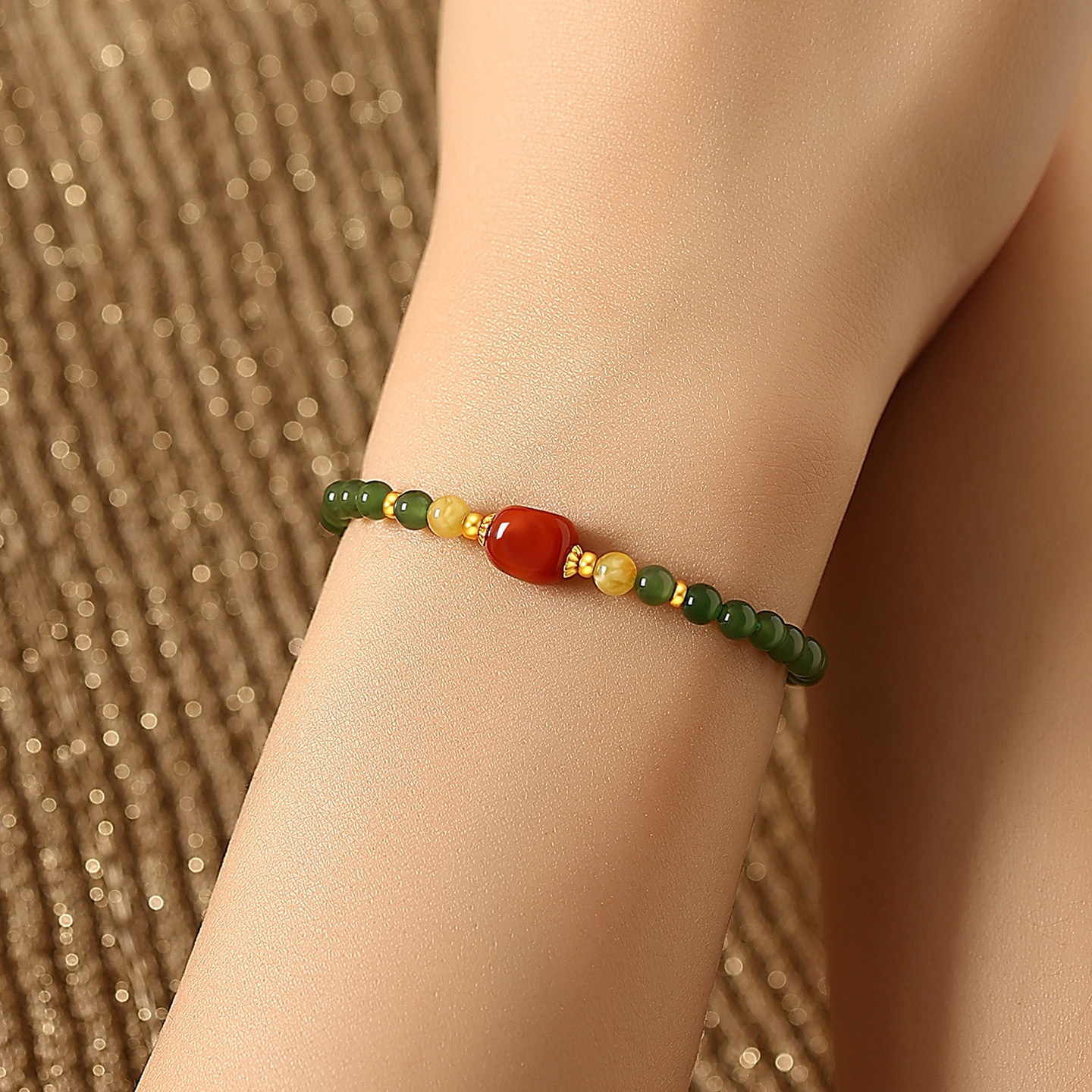天然和田玉俄料碧玉南红手串女小米珠随形牛血红火焰纹新中式手链