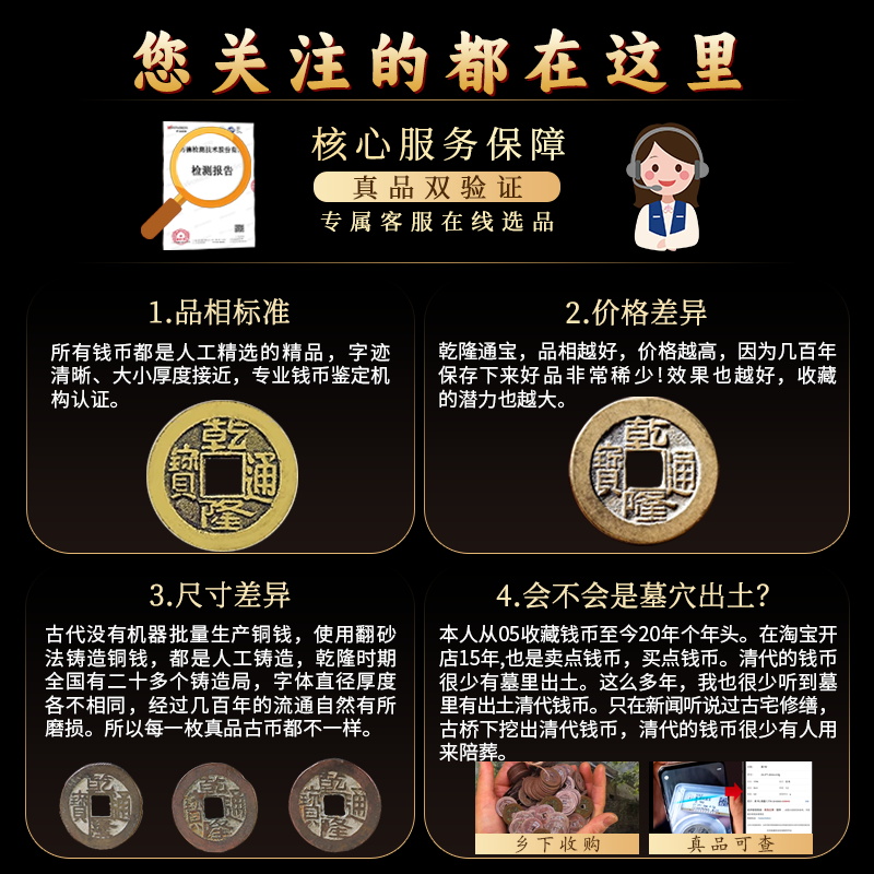 乾隆通宝古铜钱真品大样古币纯铜老式清朝仿古代收藏三枚旧盒子币