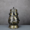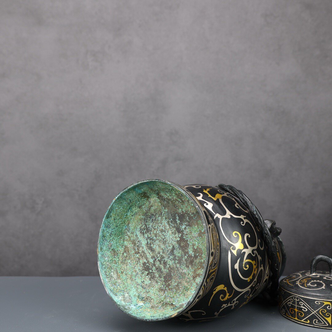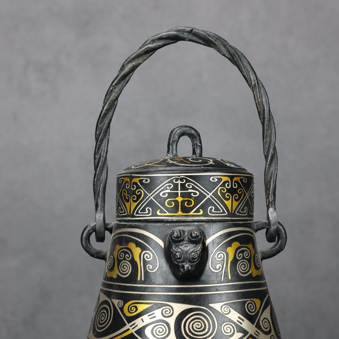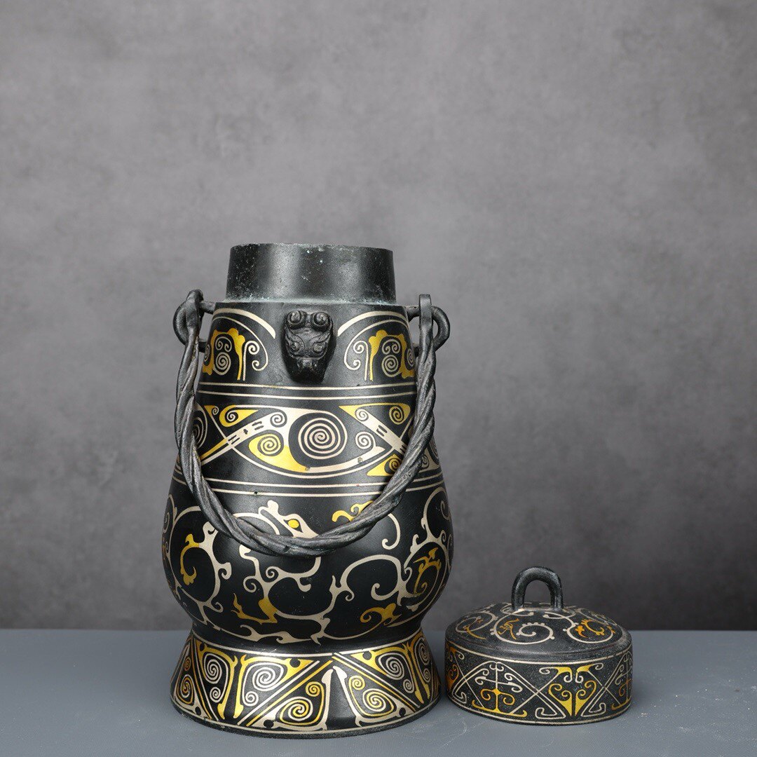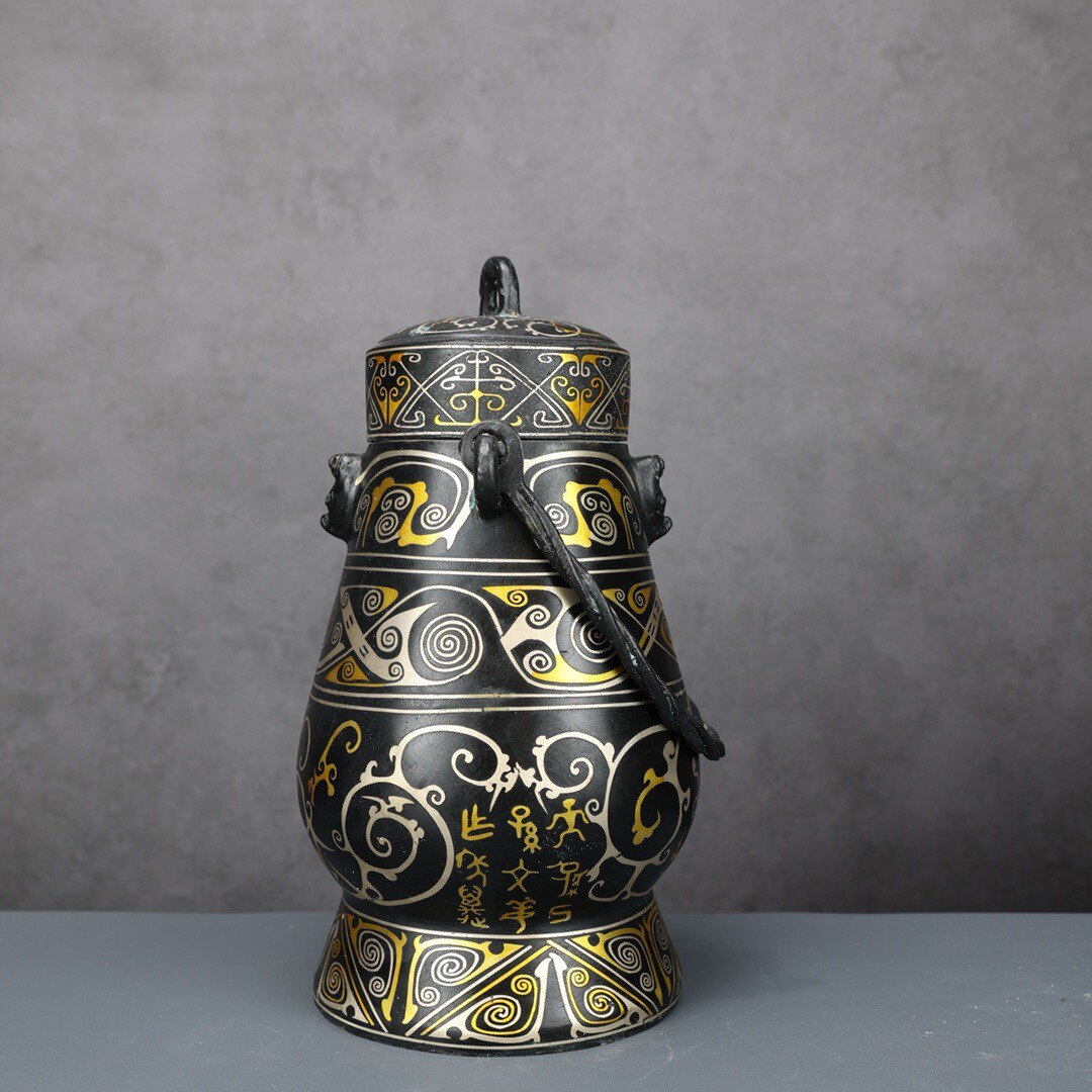 铜祥德古青铜器摆件青铜提梁卣错金银黑皮包浆古代盛酒壶摆件