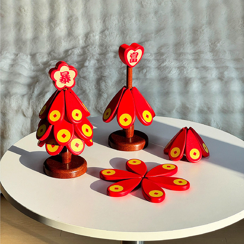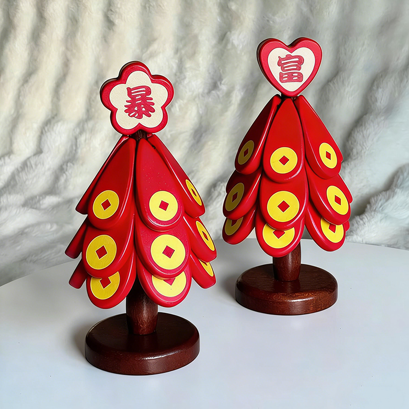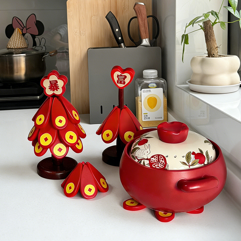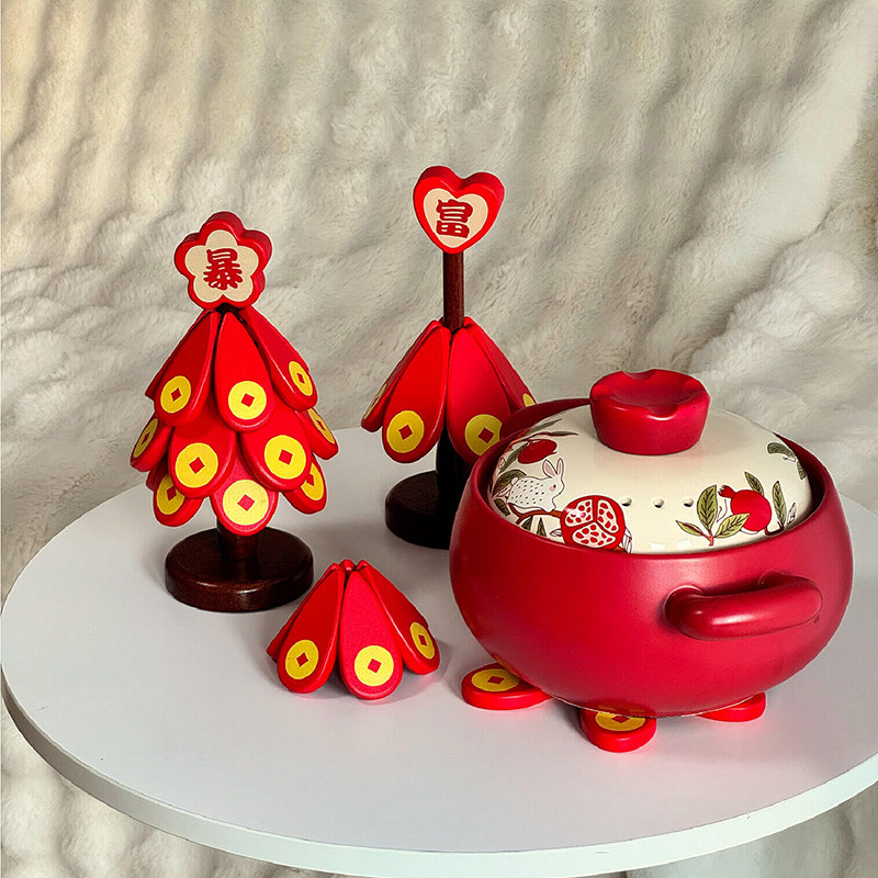 发财树隔热垫暴富2026新年摆件红色实木餐桌垫防烫耐高温砂锅杯垫