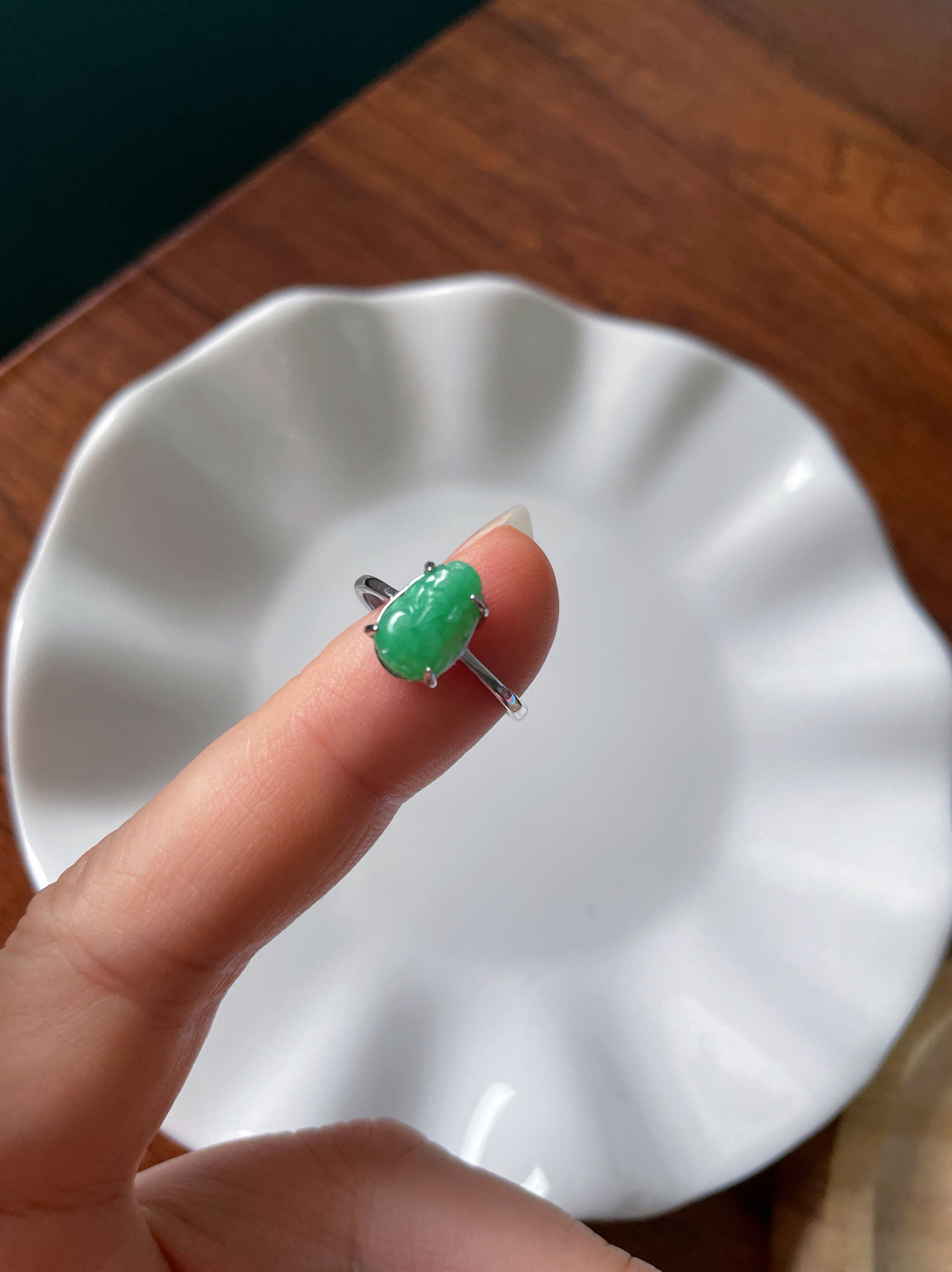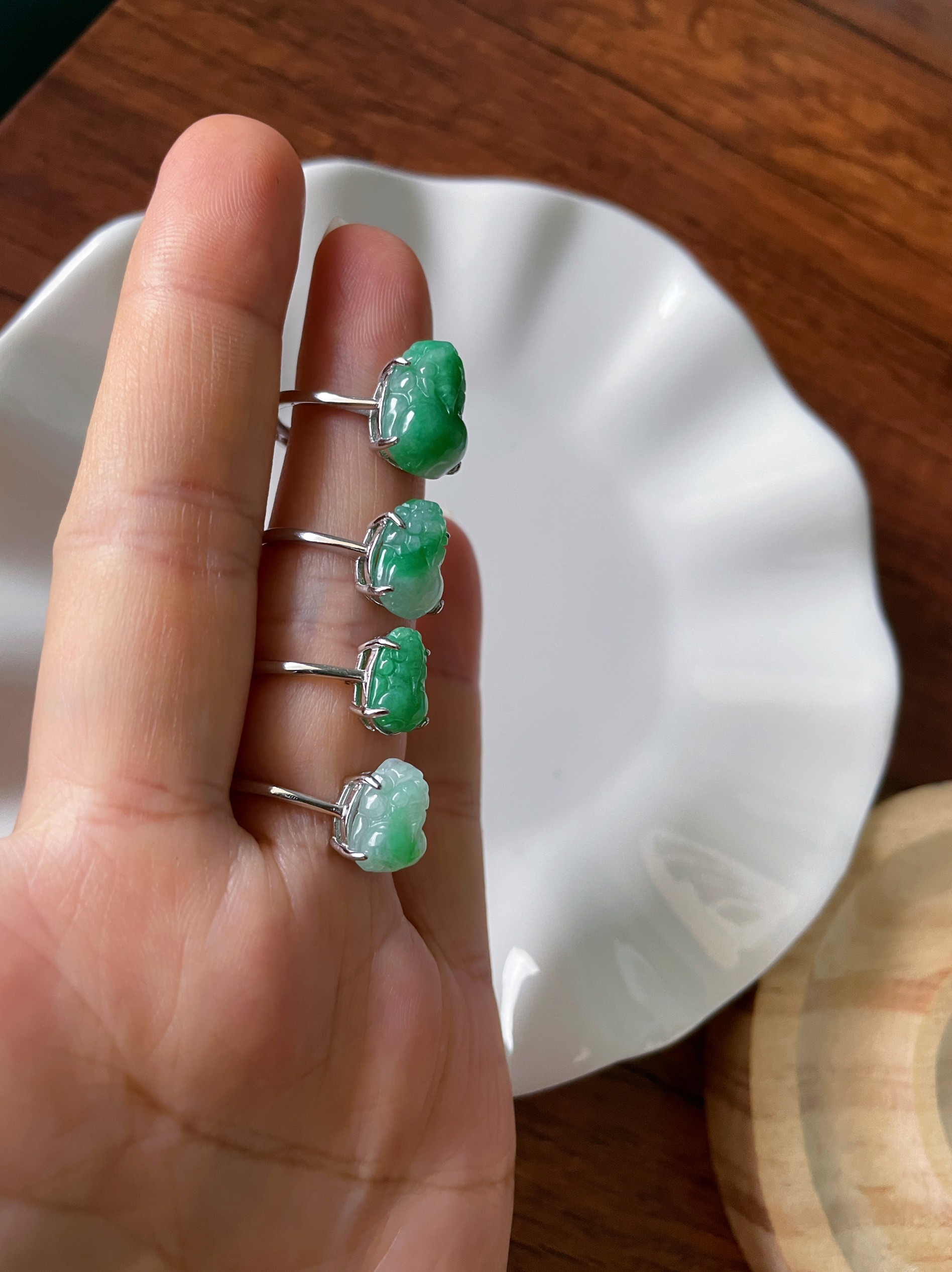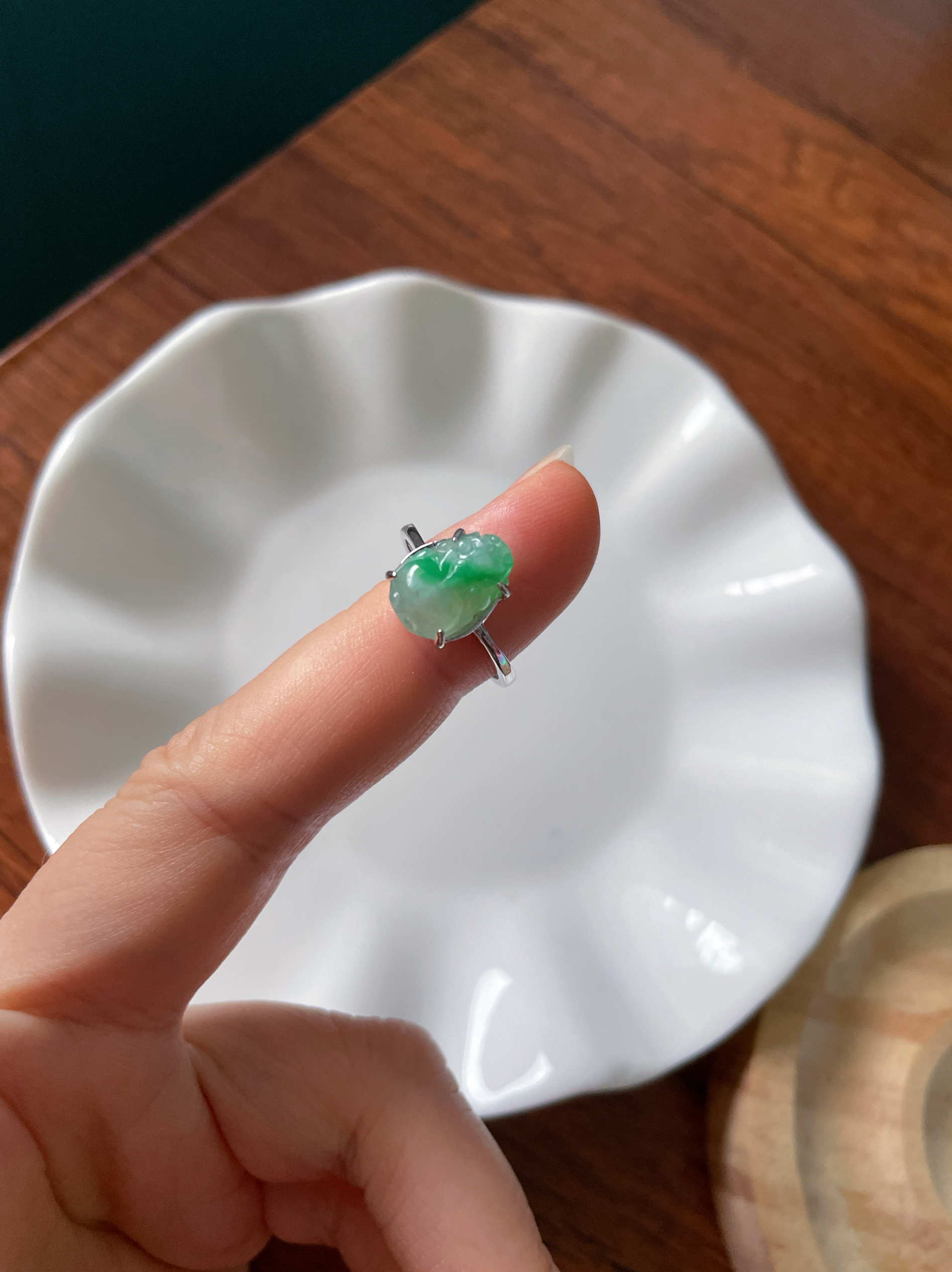 天然A货翡翠飘绿招财迷你小貔貅镶嵌925银戒指皮丘活口可调节指环