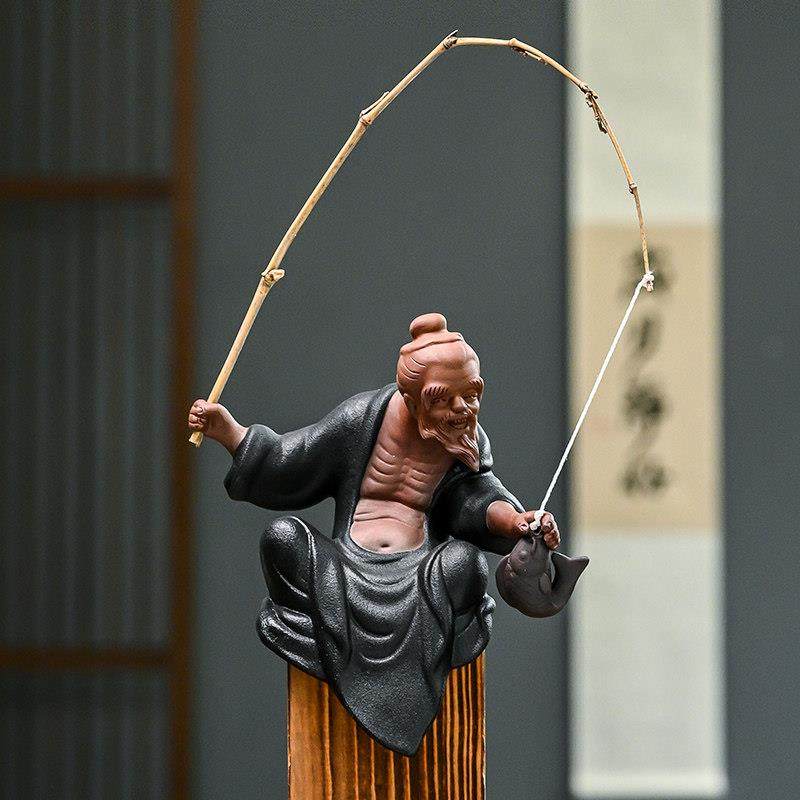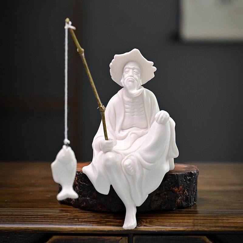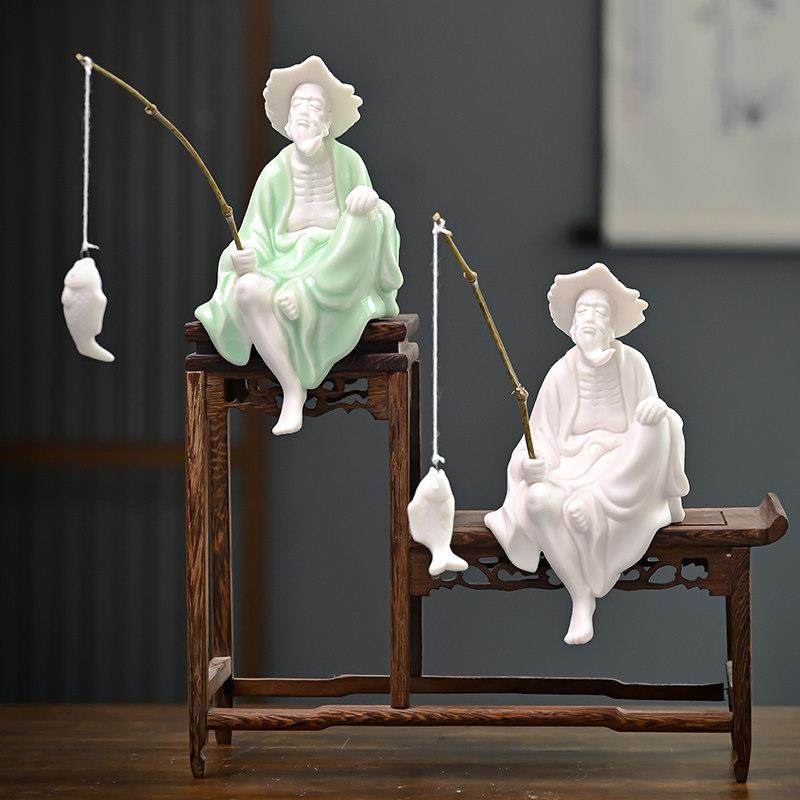 姜太公钓鱼摆件陶瓷老头钓鱼翁假山鱼缸流水器盆景造景微景观配件