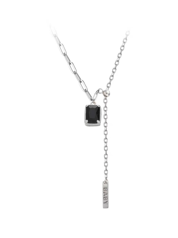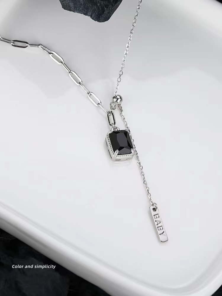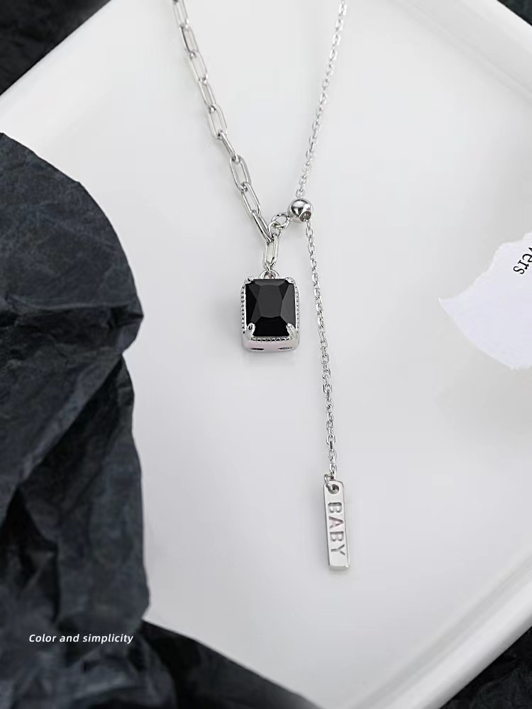 s925银黑色方牌吊坠项链2025年新款女项链女高级设计感小众锁骨链