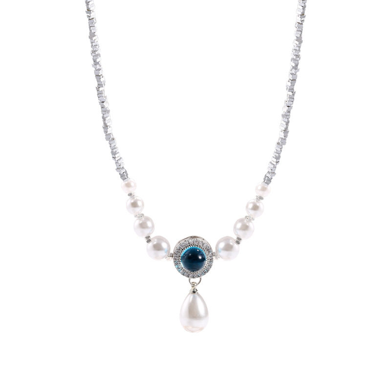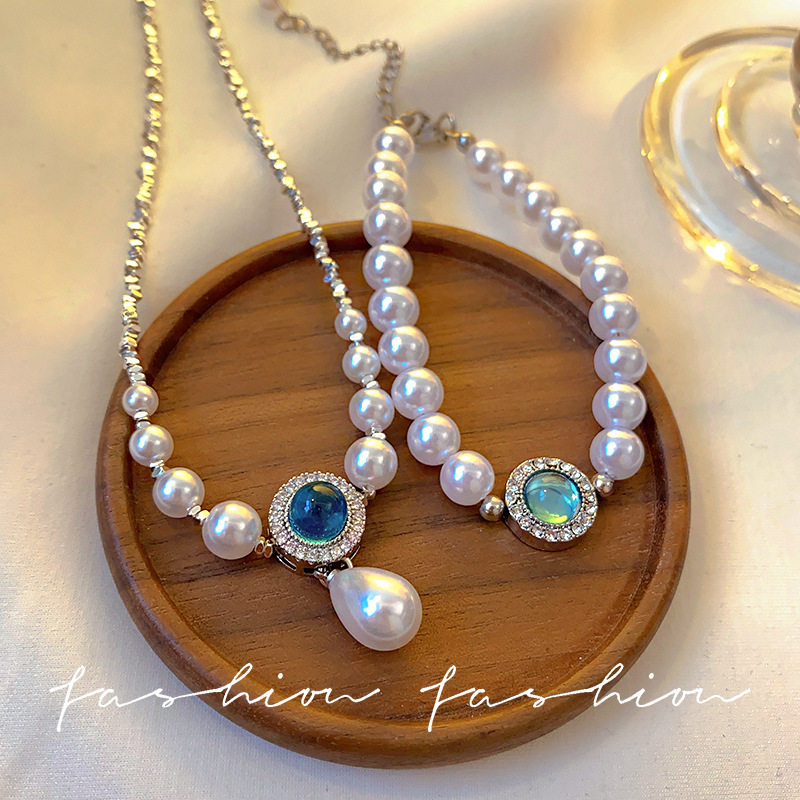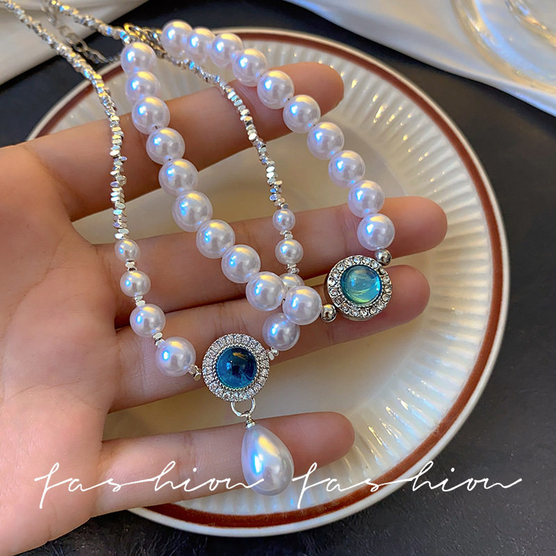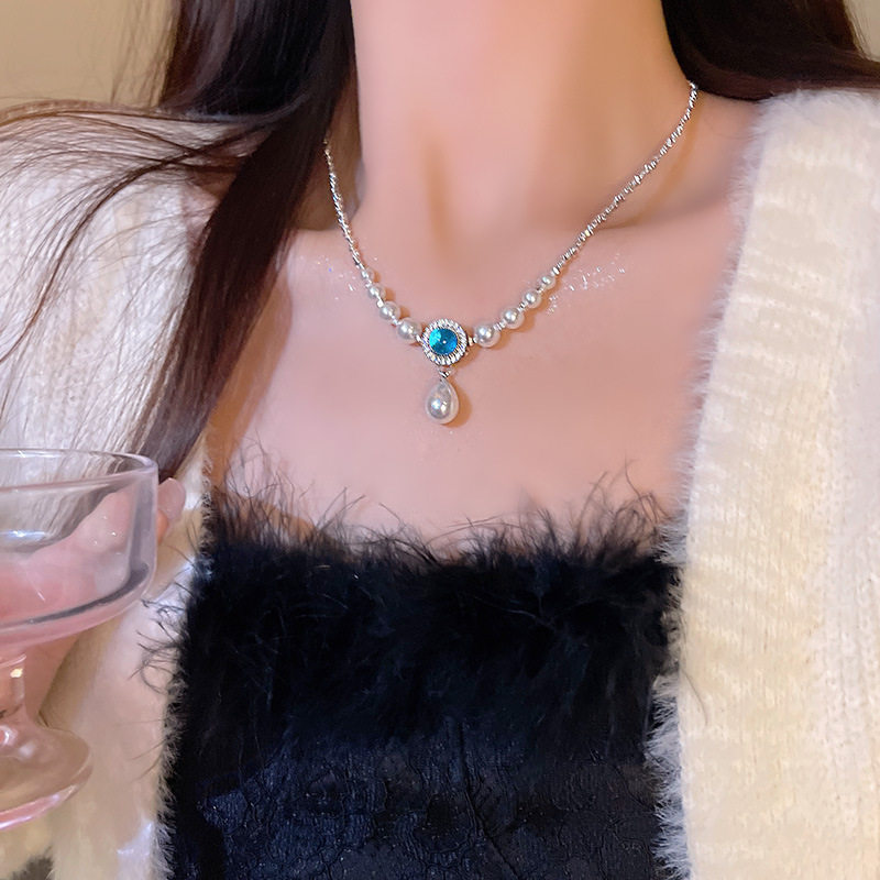 海蓝宝珍珠项链高级感蓝色锆石项链小众百搭法式复古配饰ins风