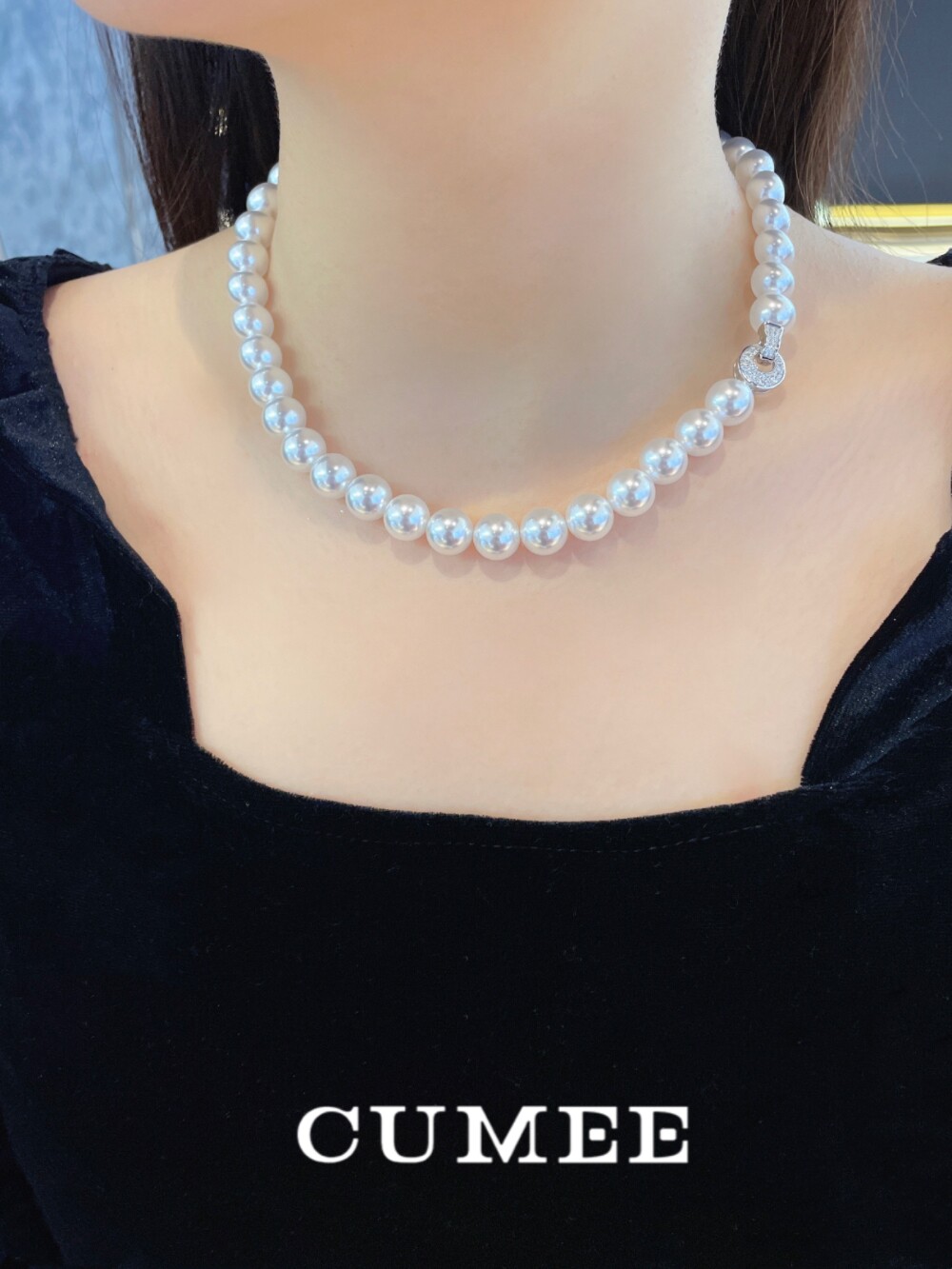 CUMEE 简约日常珠链 10mm环环相扣人工澳白色贝珠项链.银镀金