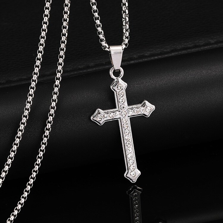 欧美跨境镶钻金色十字架吊坠项饰时尚简约不掉色毛衣链男服饰礼品