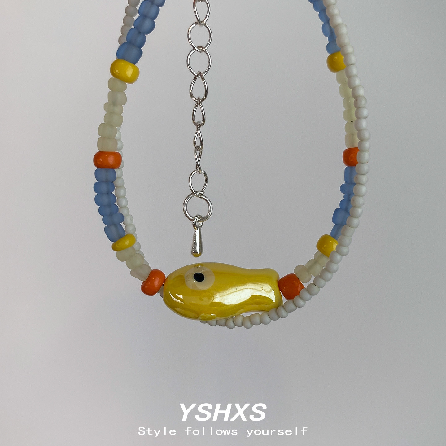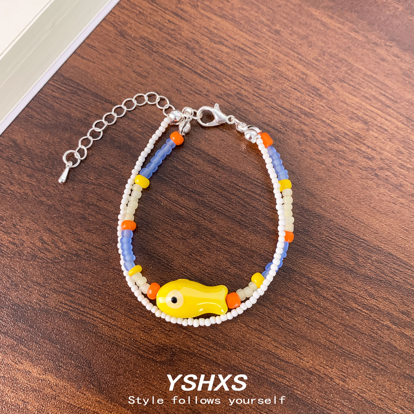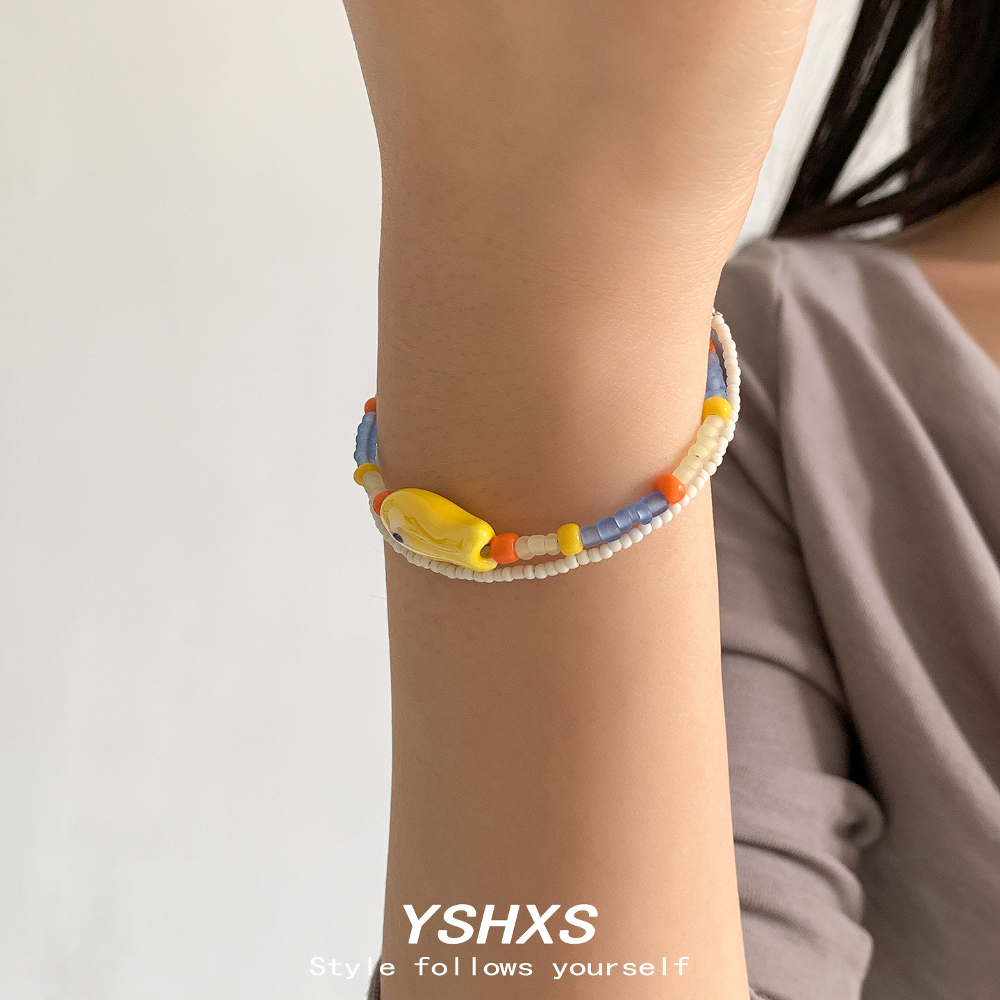 多巴胺彩色串珠手链女缤纷夏日黄色小鱼吊坠天然珠子双层手链