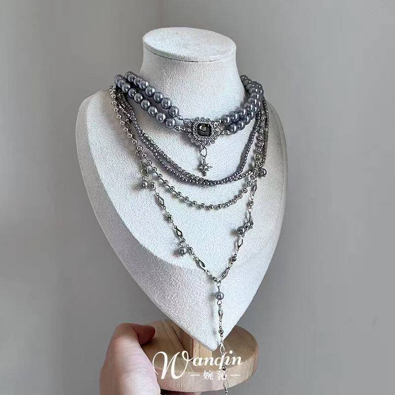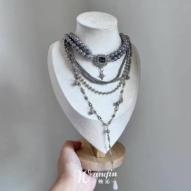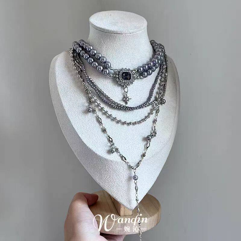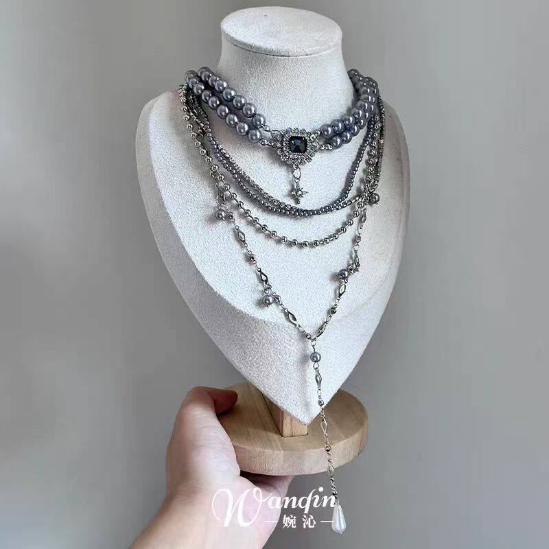 「雾中缪斯」复古灰色珍珠流苏项链法式重工高级感多层叠戴锁骨链