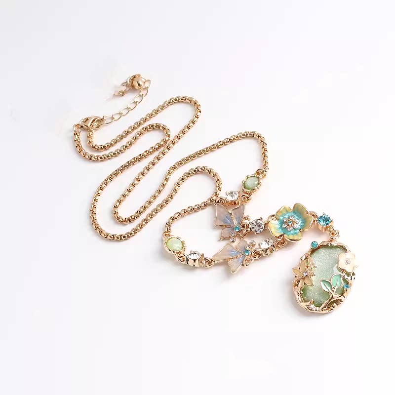sumni/复古田园风珐琅滴釉蝴蝶花卉中古粉绿石毛衣链女项链春夏