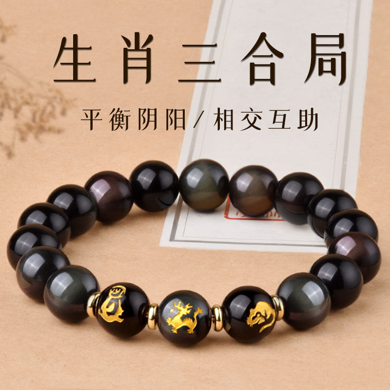 天然黑曜石三合手串男女正品定制巳酉丑黑色生肖属蛇鸡牛贵人手链