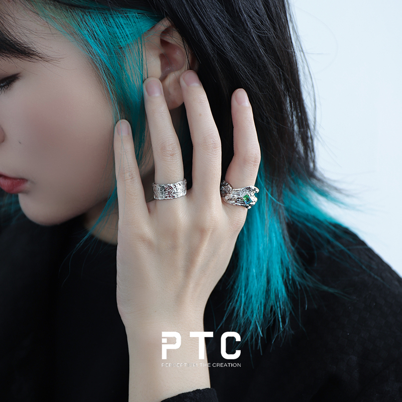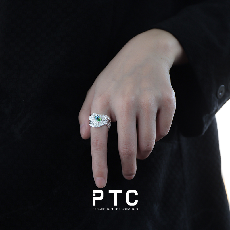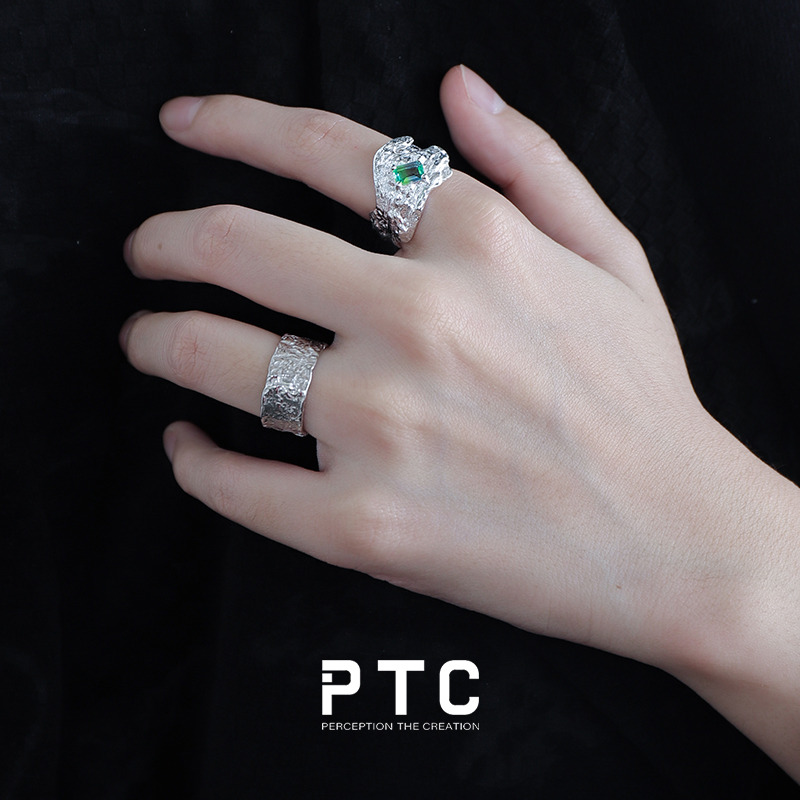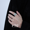 PTC绿色渐变宝石宽面肌理戒指小众设计925纯银宽面开口可调节男女