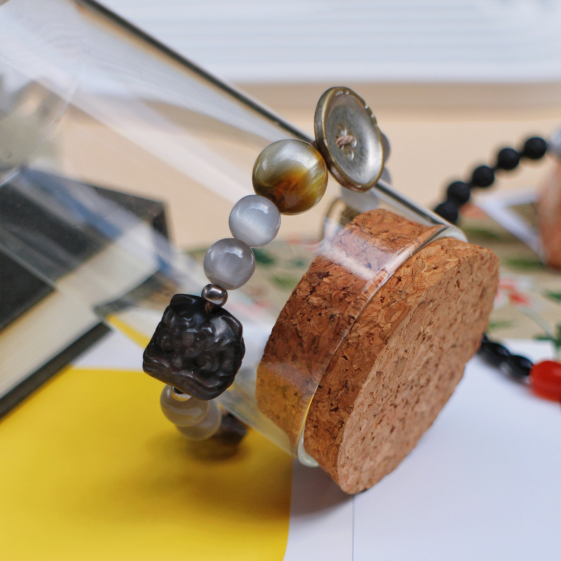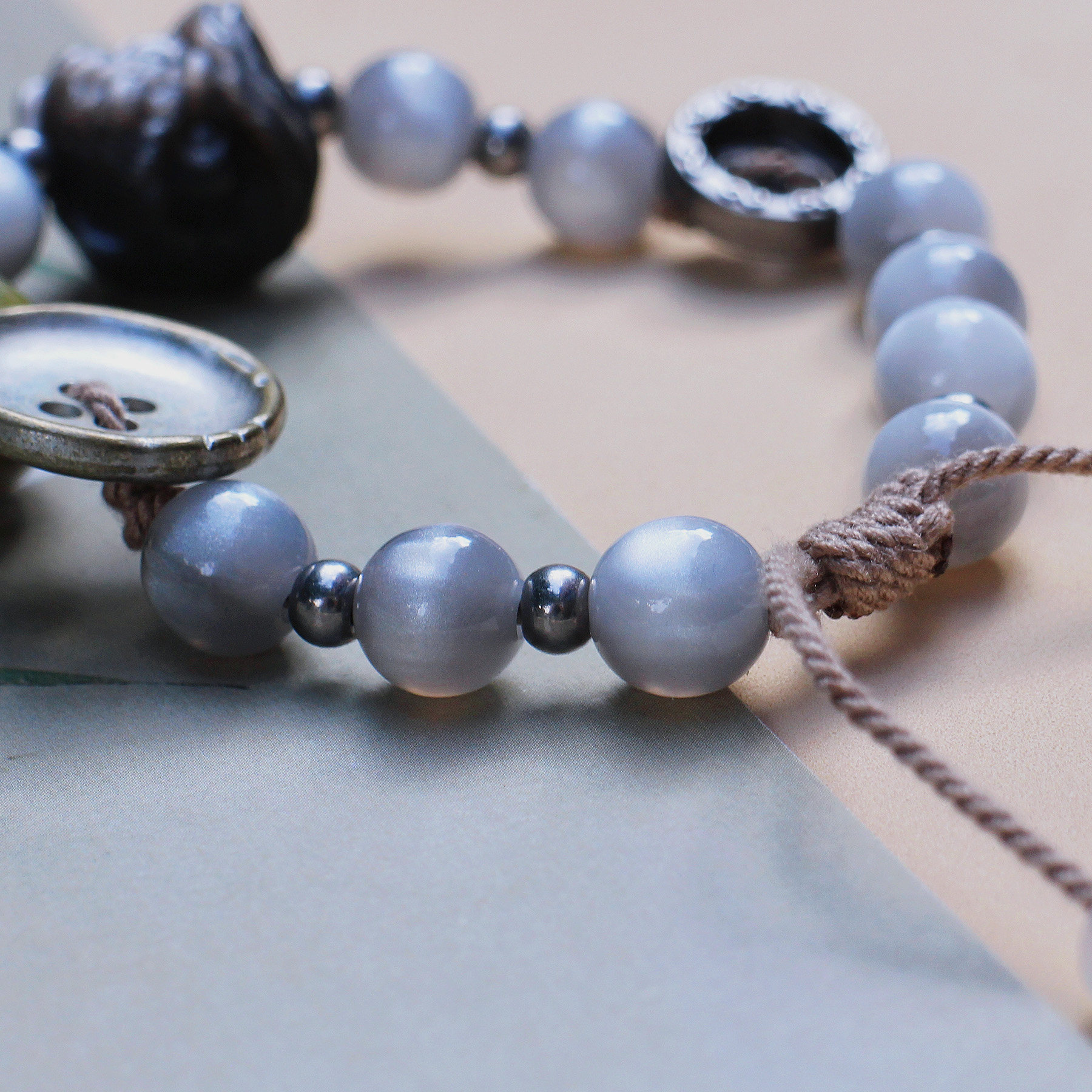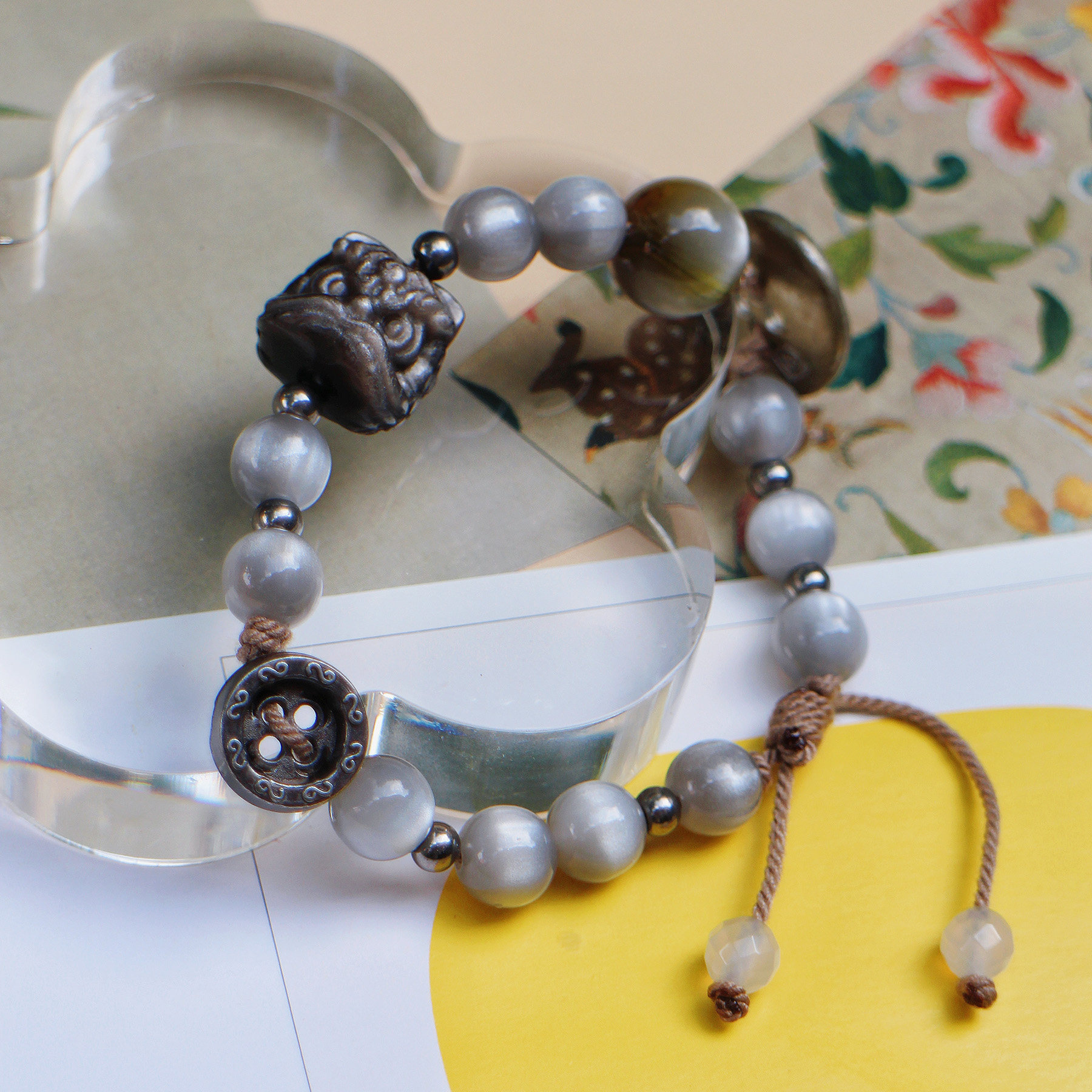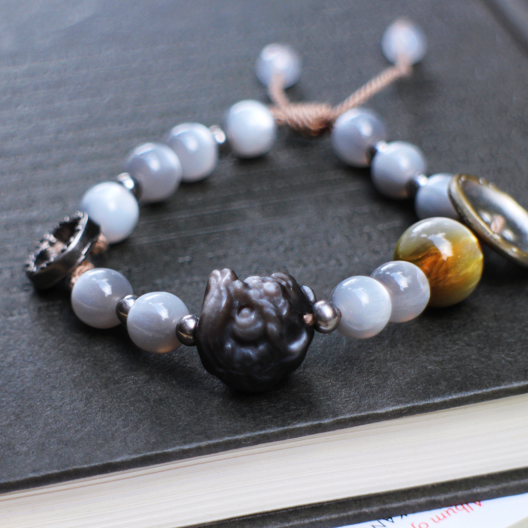 【曜银河】原创情侣手编绳黑曜石醒狮手串新中式灰色复古可调节女