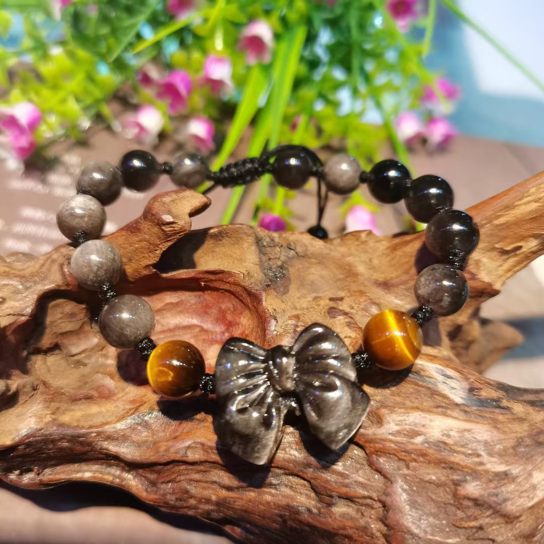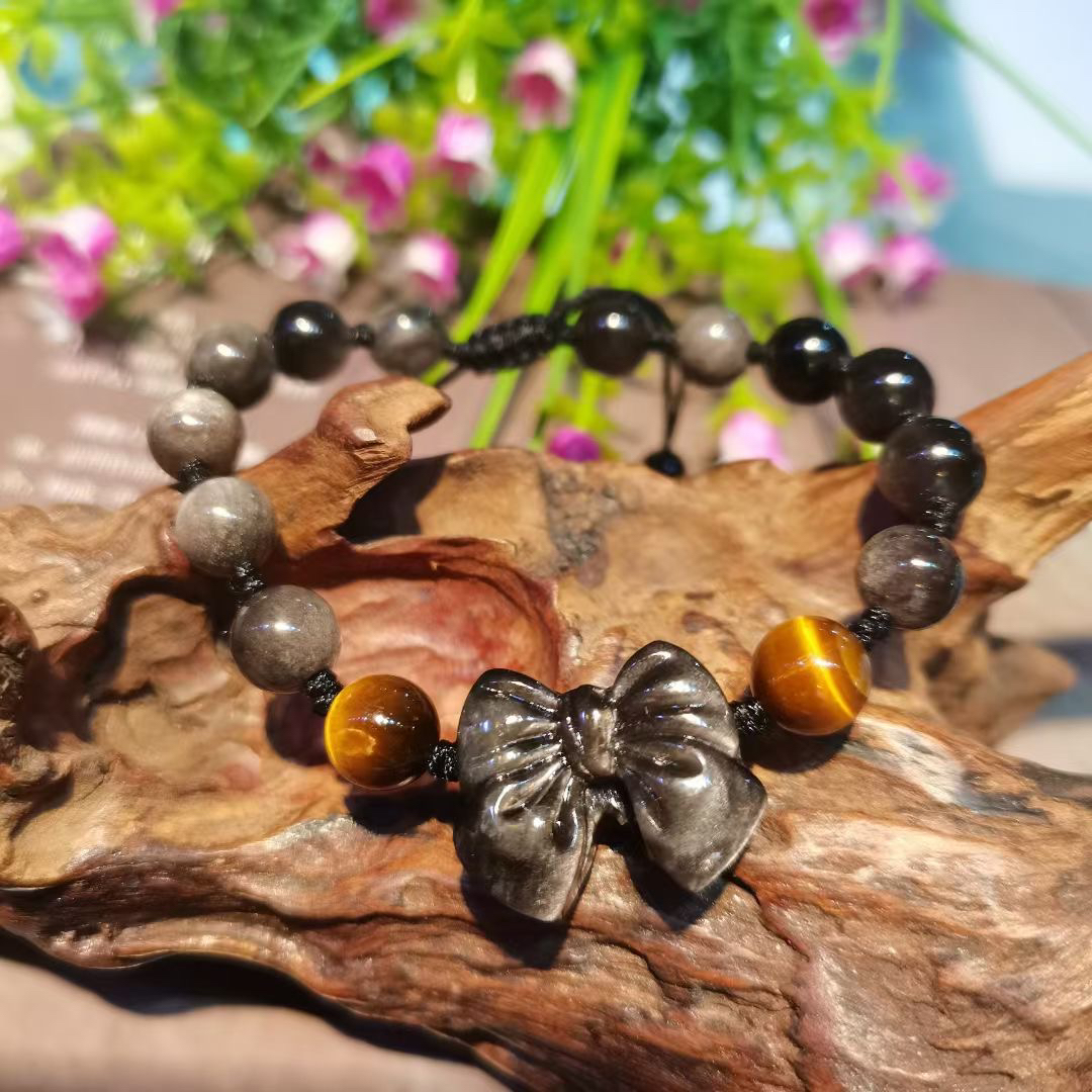 墨西哥天然银耀石黑新款立体蝴蝶结手编手链蝴蝶结
