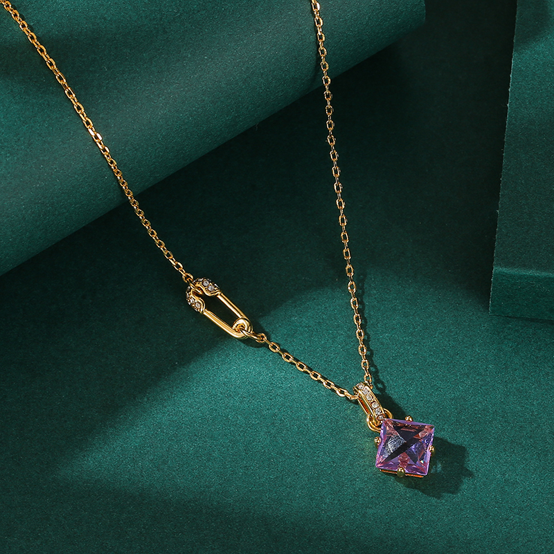 潮人韩版时尚设计感方形紫色水晶宝石吊坠金色镶钻别针锁骨项链女