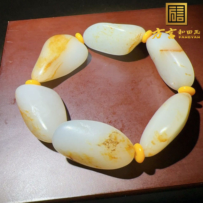 方言收藏级和田玉玉龙河老熟红金皮白玉籽料原石无修型手链手串w1