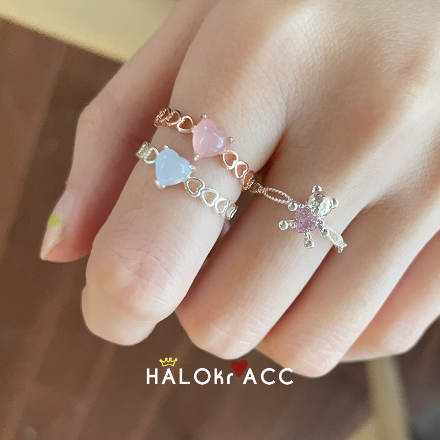 HALOkrACC韩国进口金泰妍同款温润果冻粉蓝水晶心小熊戒指