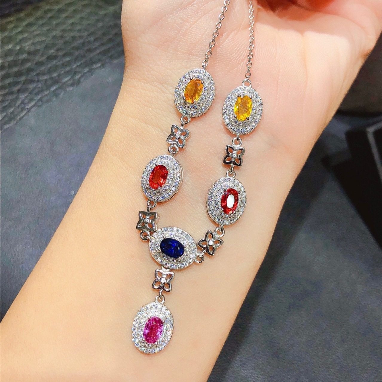 天然彩色蓝宝石项链 925银镶嵌 带有加长链可调节