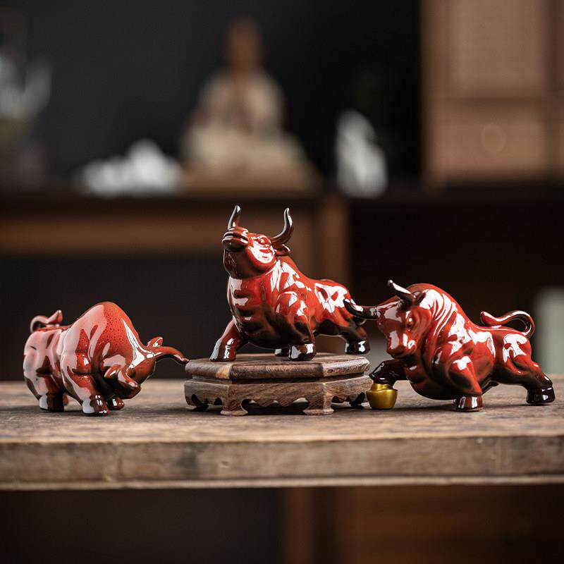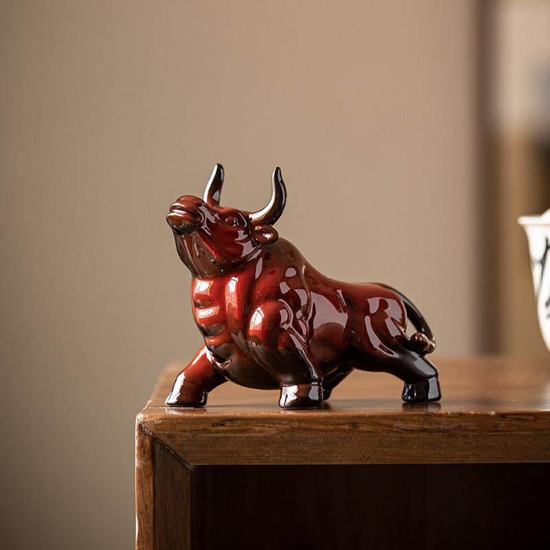 陶瓷红色牛小摆件牛气冲天家居招财装饰品办公室吉祥物生肖牛礼品