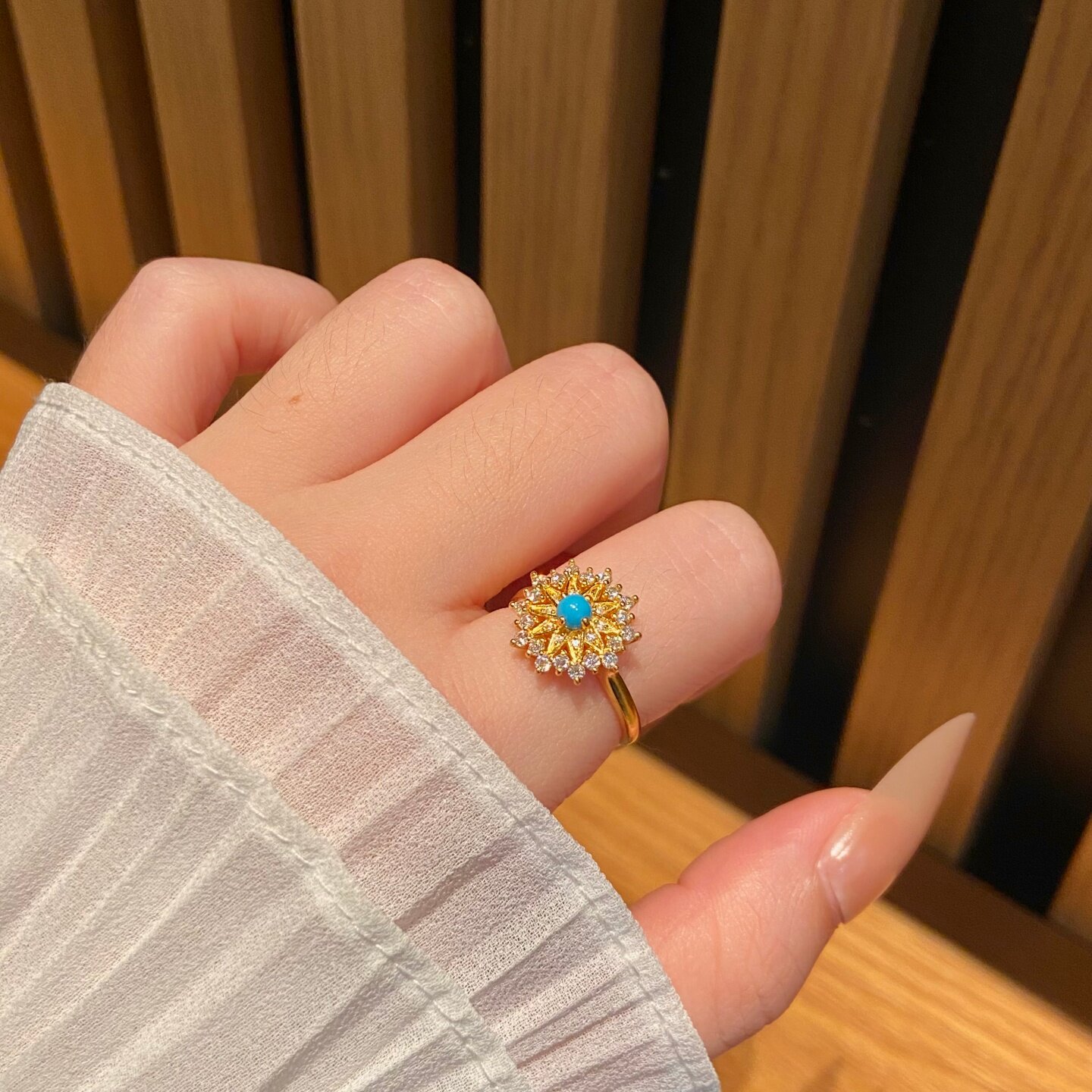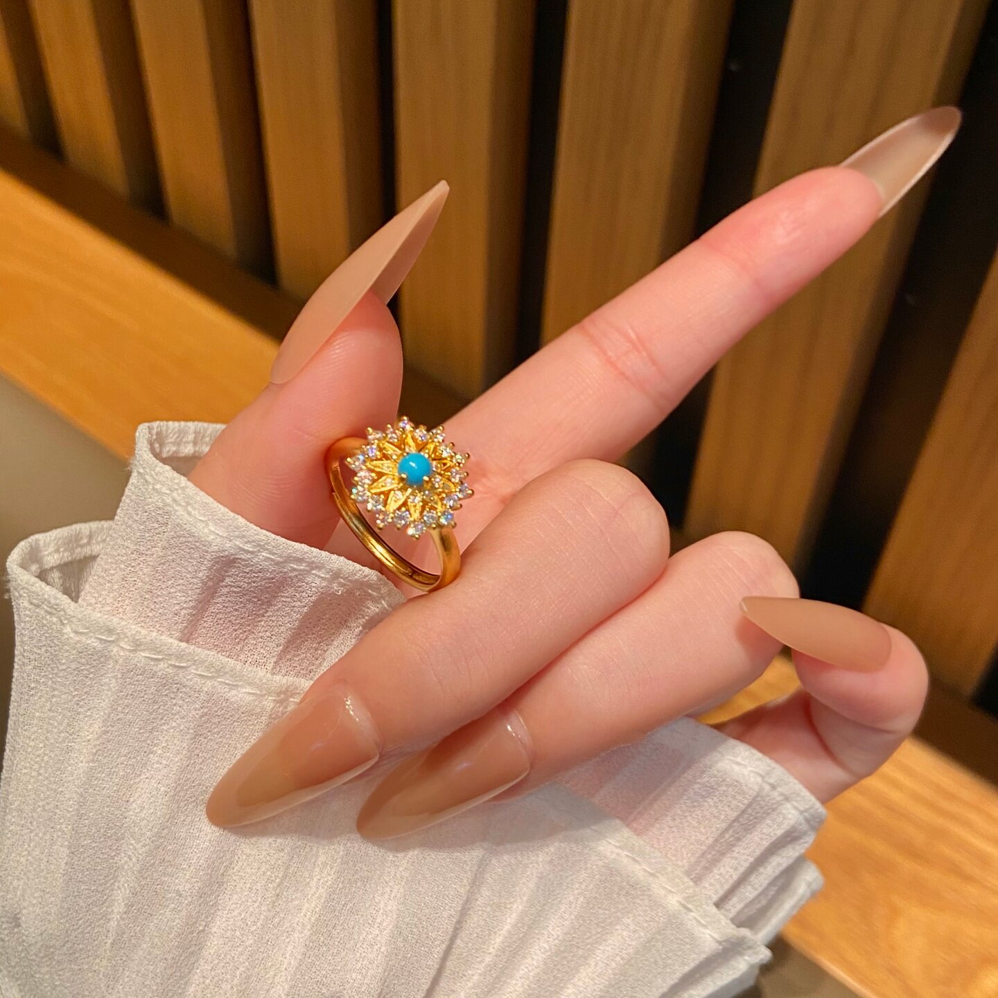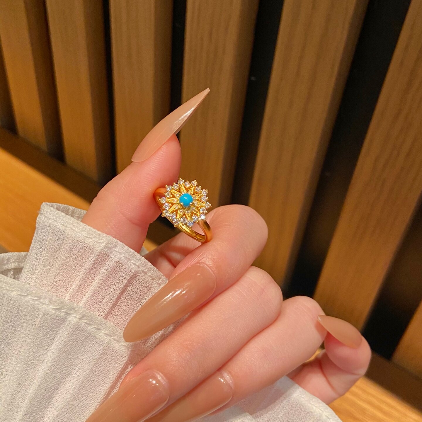黄金星芒雪花戒指 足金999莫桑钻绿松石对戒结婚送女友生日礼物男