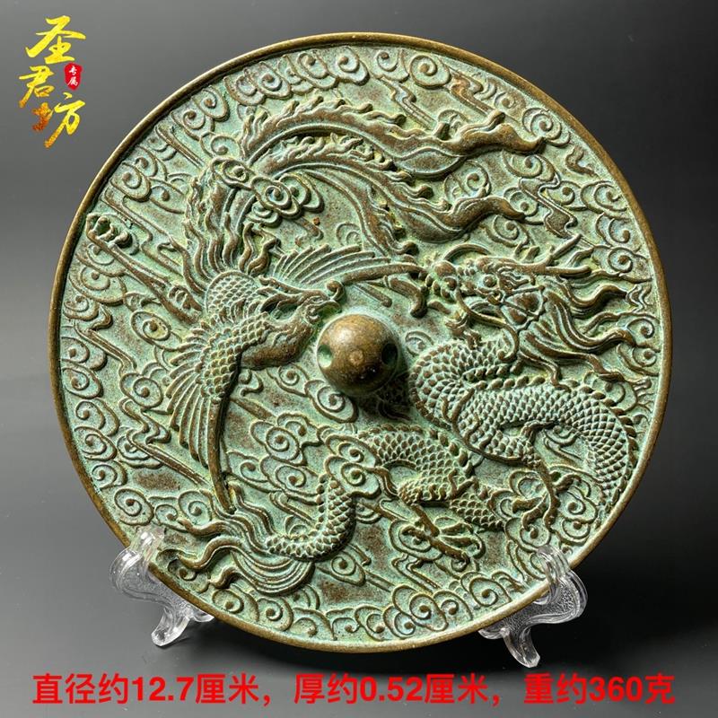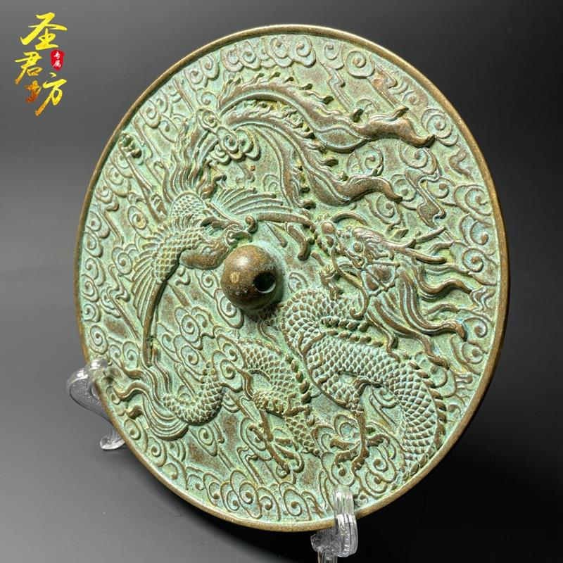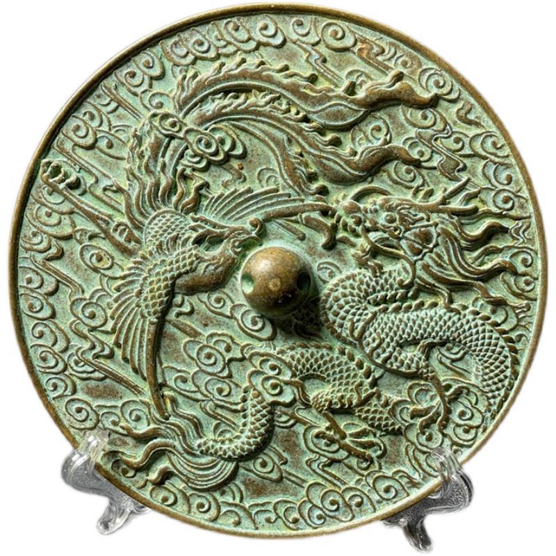 复古纯铜大号青龙凤图案铜镜做旧摆件家居玄关柜客厅装饰品
