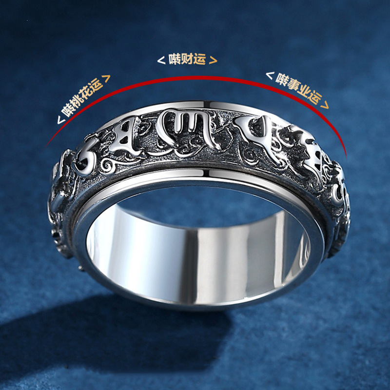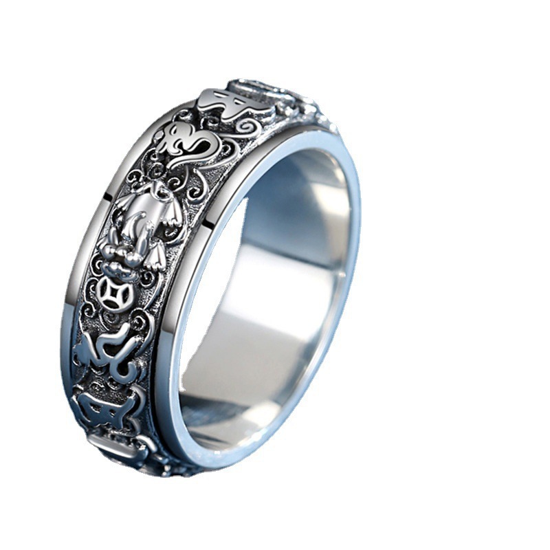 999纯银戒指六字真言戒指男女貔貅可转动单身情侣食复古旋转指环