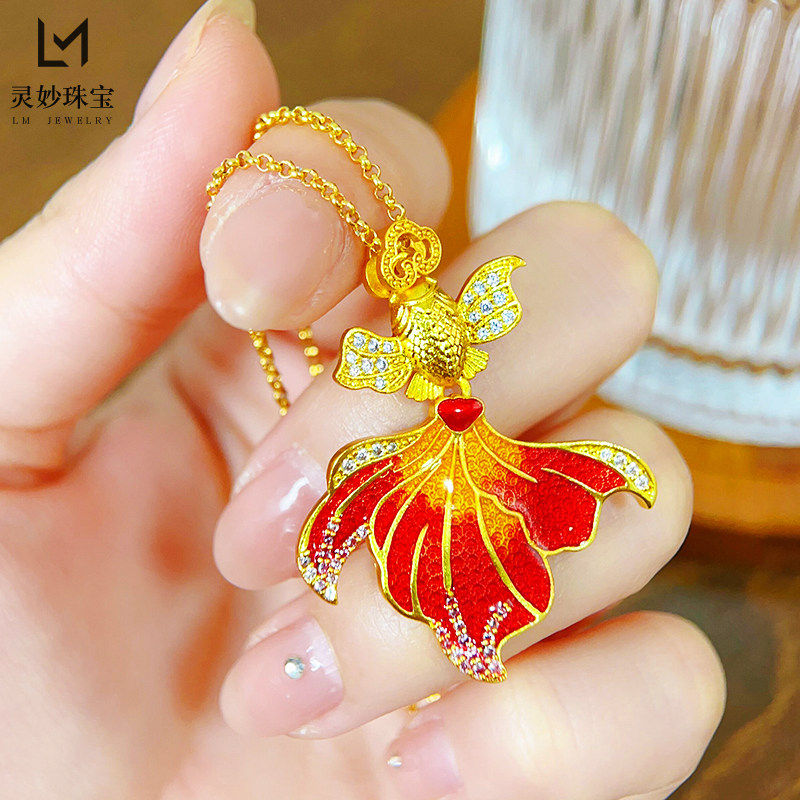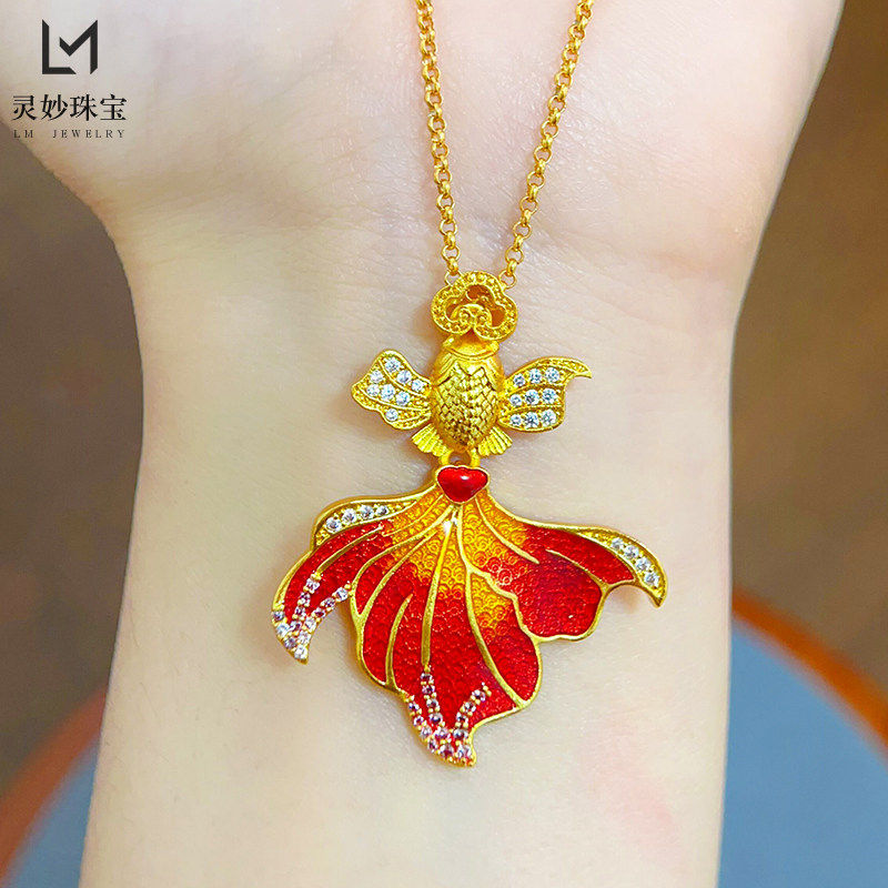 沙金999珐琅彩锦绣红色锦鲤鱼吊坠金鱼项链女微镶国潮婚庆送礼物
