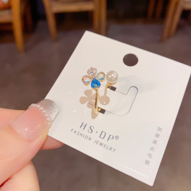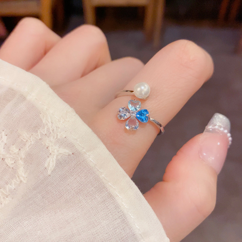 秋冬新款气质时尚简约镶钻蓝色花瓣珍珠开口戒精致轻奢百搭食指戒