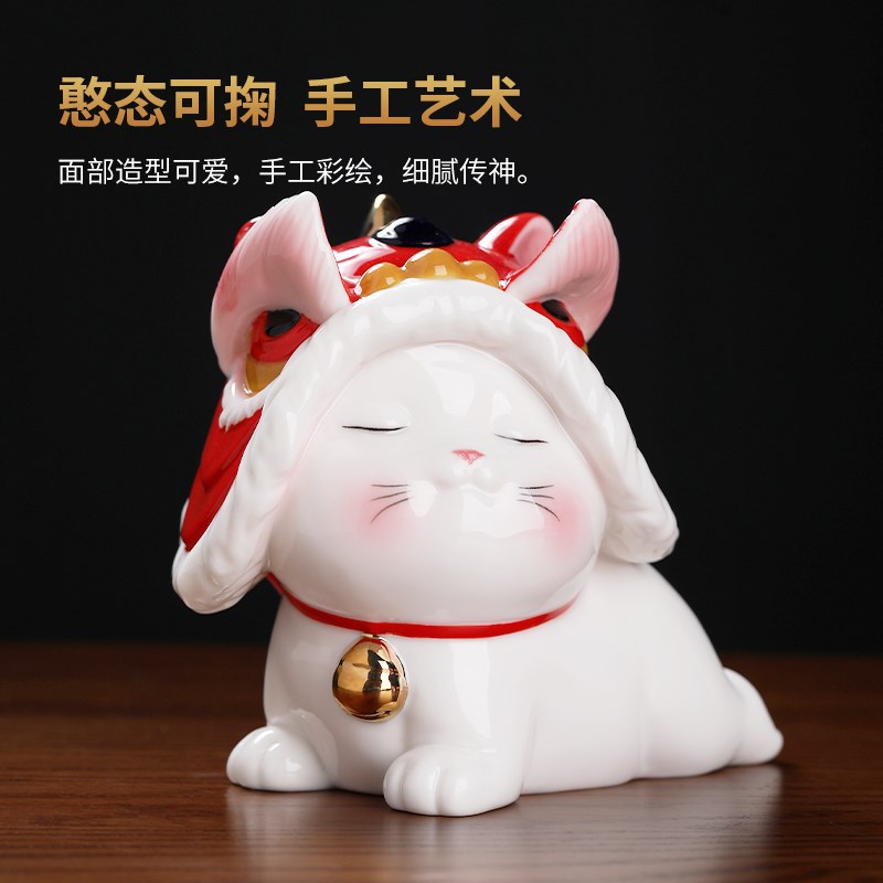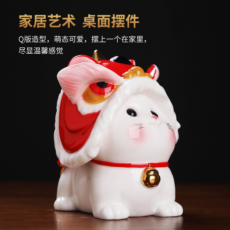 东方泥土陶瓷招财猫小摆件中式客厅办公室桌面国潮红色舞狮装饰品